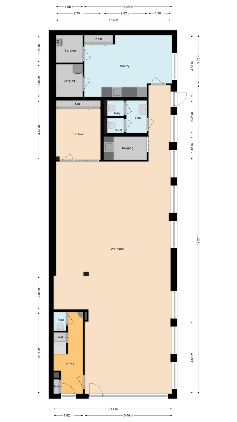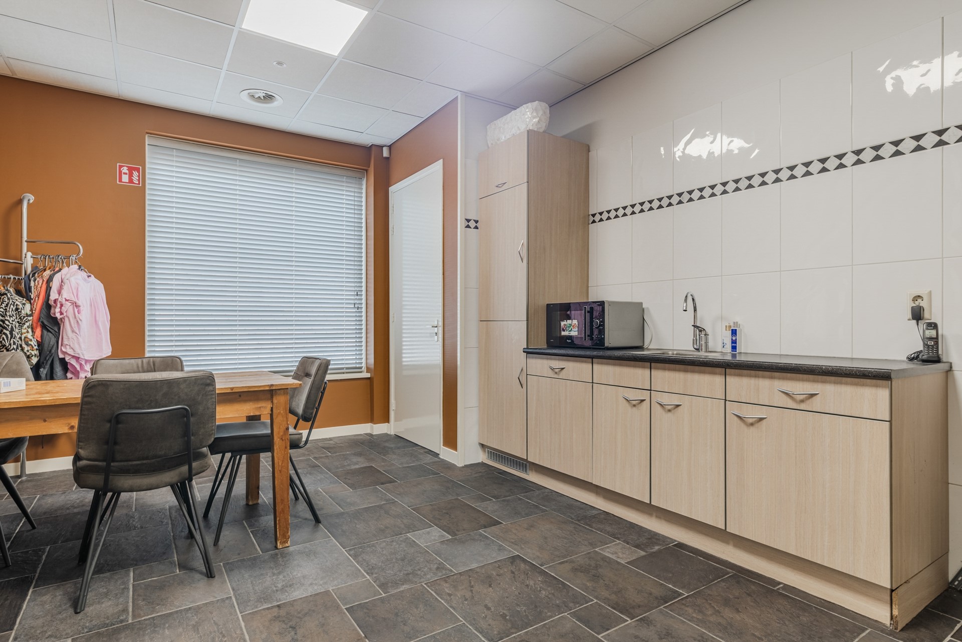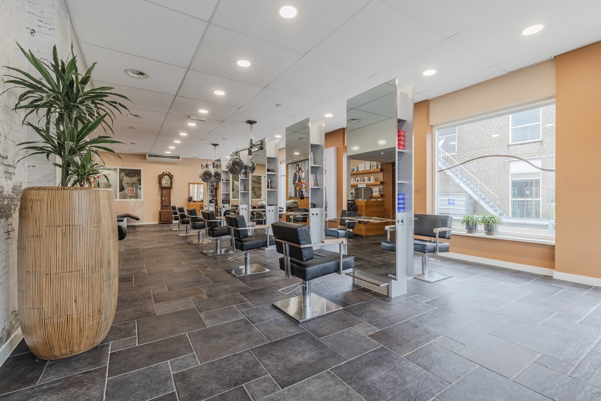 BEGANE GROND KAPSALON: Je kunt de kapsalon zowel via de voorkant als de zijkant binnengaan. Via de voorzijde kom je direct in de grote open winkelruimte. De ruimte is zeer licht door de vele ramen aan de voor- en zijkant. In de hoek is een kantoorruimte met een vaste kast. Berging met keukenblok met een spoelbak. Toiletruimte met wastafel en 2 separate toiletten. Kantine met open keuken voorzien van vaatwasser en koelkast met vriezer. Technische ruimte met cv ketel Nefit 2021. Wasruimte met wasmachine- en droger aansluiting.