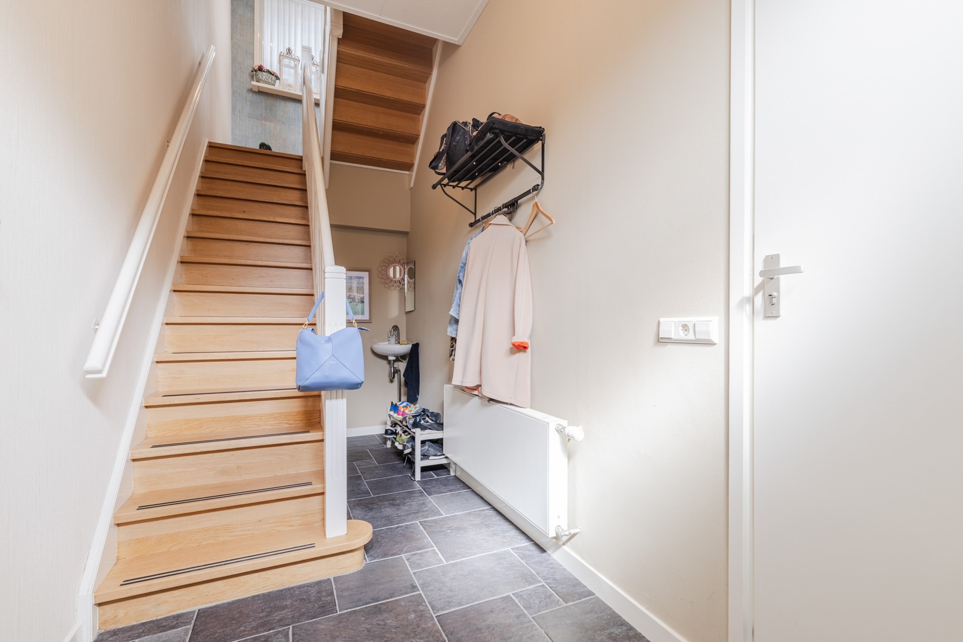BEGANE GROND APPARTEMENT: Entree, hal, garderobe, meterkast, toiletruimte met toilet, los fonteintje en een vaste trap naar de 1e verdieping.