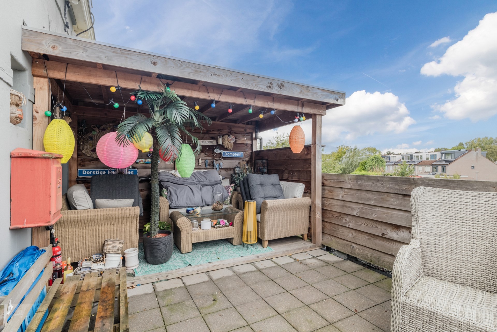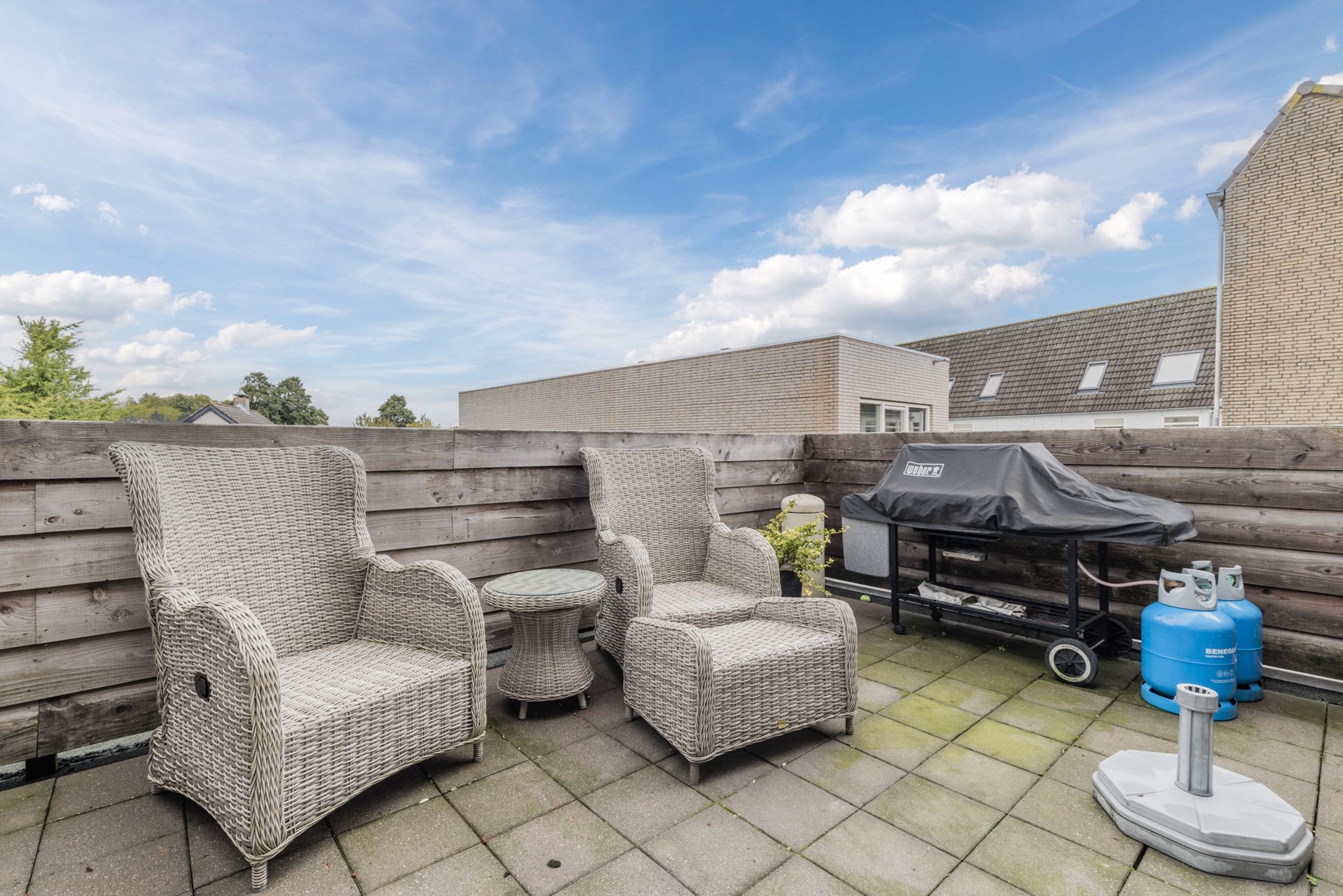 Riant dakterras van ca.27 m2 met vrij uitzicht. Aan de voorzijde is nog een balkon van ca.2 m2 op het zuiden.