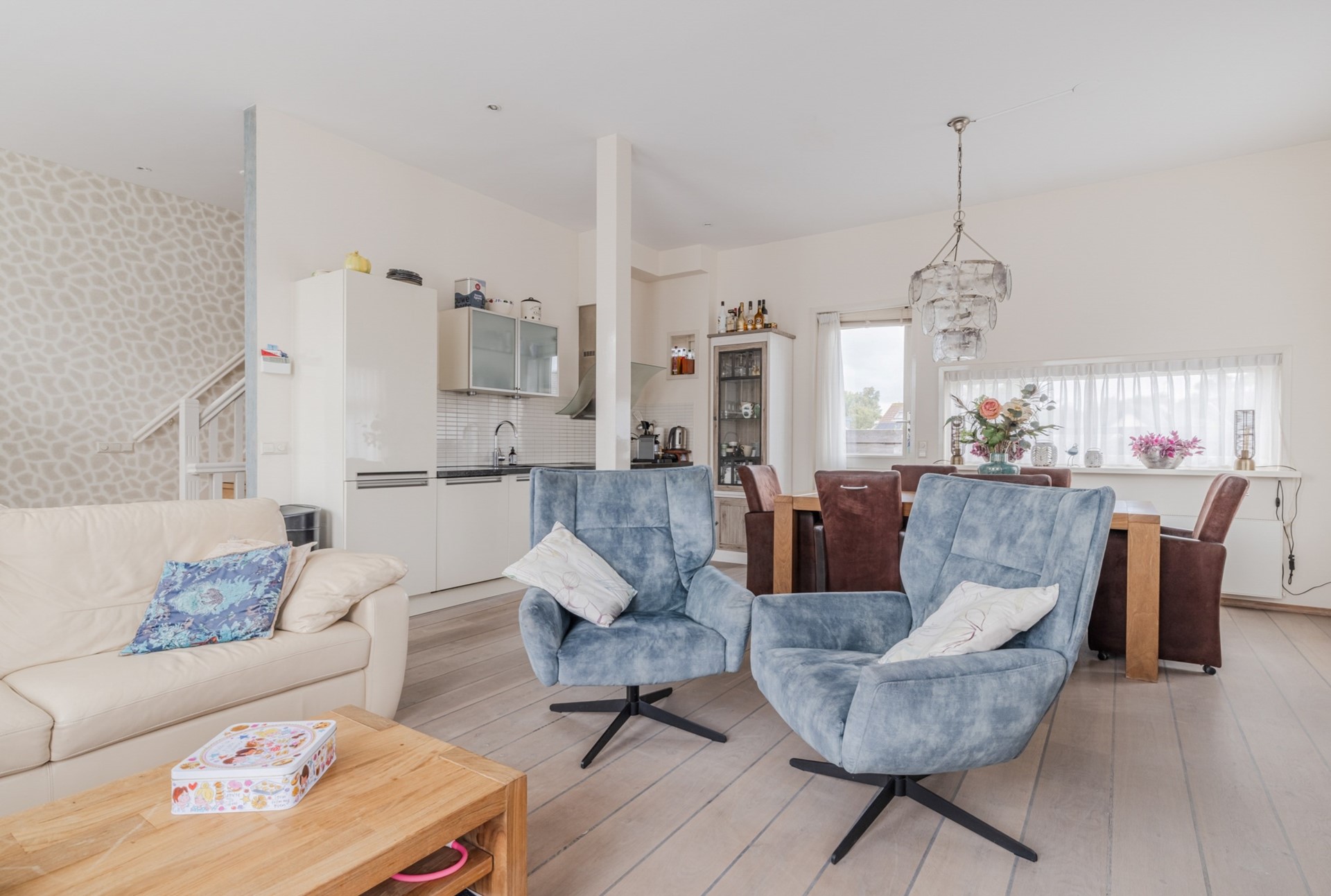 De overloop en vaste trap naar de 2e verdieping. Ruime lichte woonkamer met veel ramen en toegang tot het balkon en dakterras. Modern open keuken voorzien van koelkast met vriezer, vaatwasser, combimagnetron, elektrisch koken en een afzuigkap. Balkon van ca.2 m2 aan de voorzijde. Ruim dakterras van ca.27 m2 aan de achterzijde.
