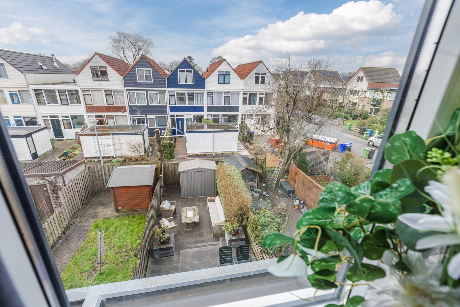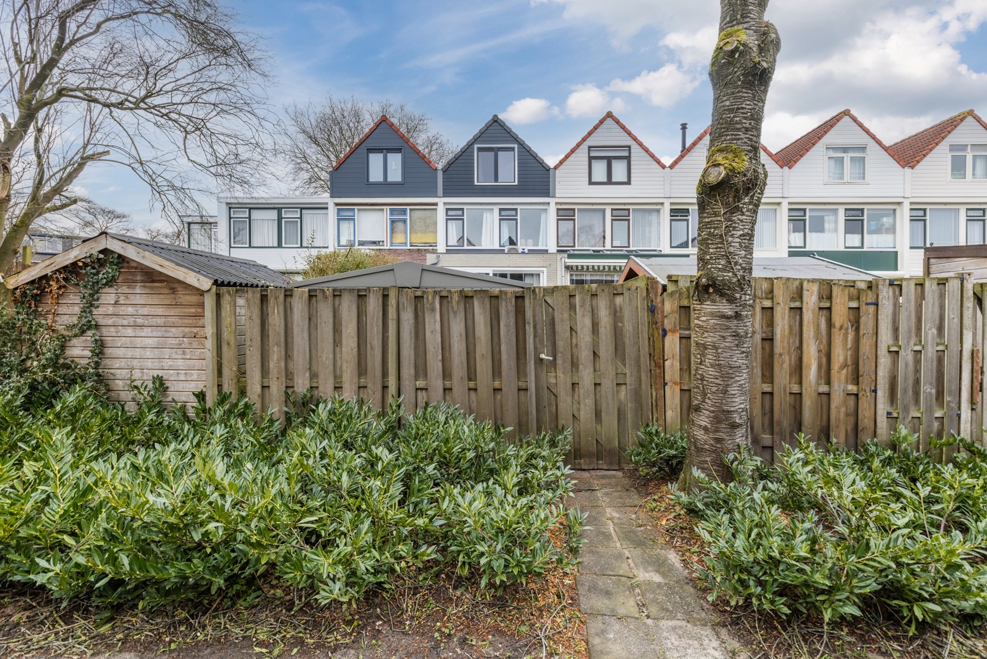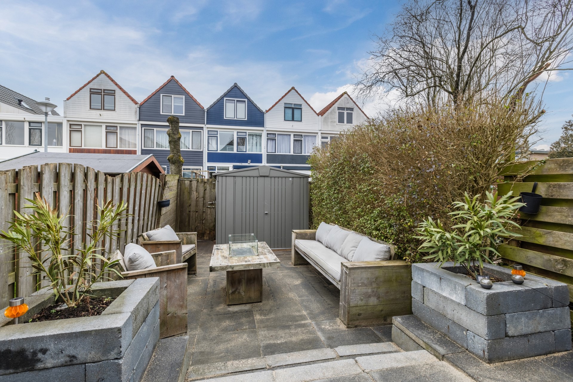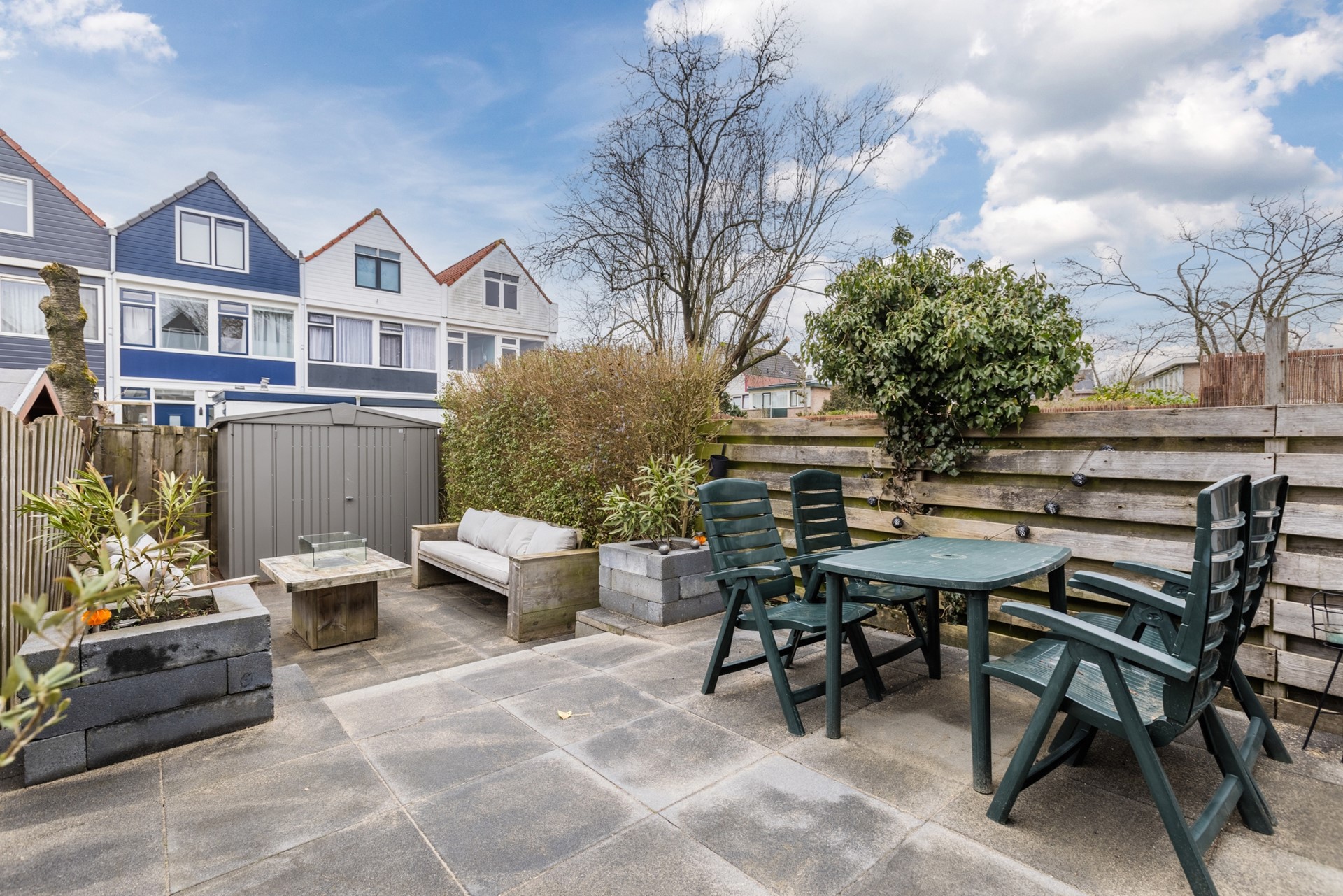 De voortuin is netjes bestraat en hier staat de berging. Riante zonnige achtertuin op het westen gelegen is recent aangelegd en onderhoudsvrij.