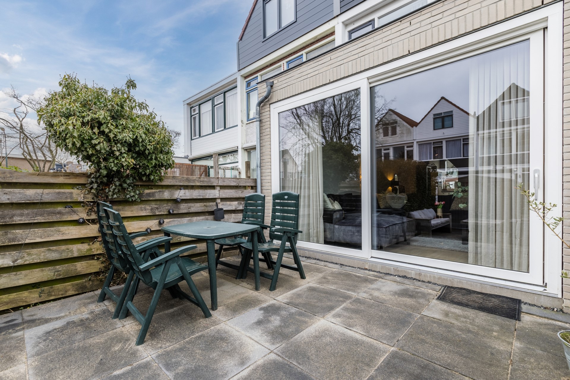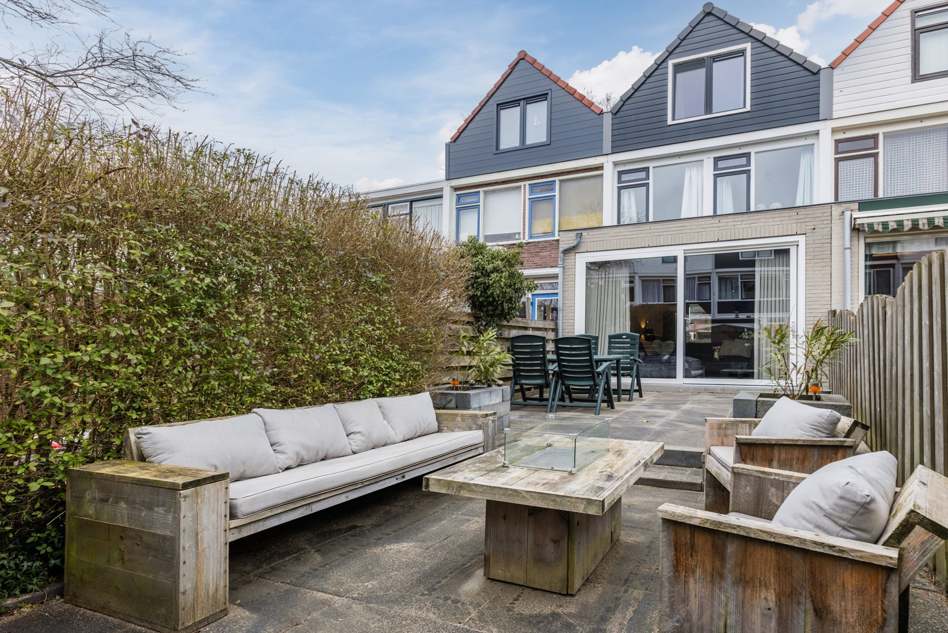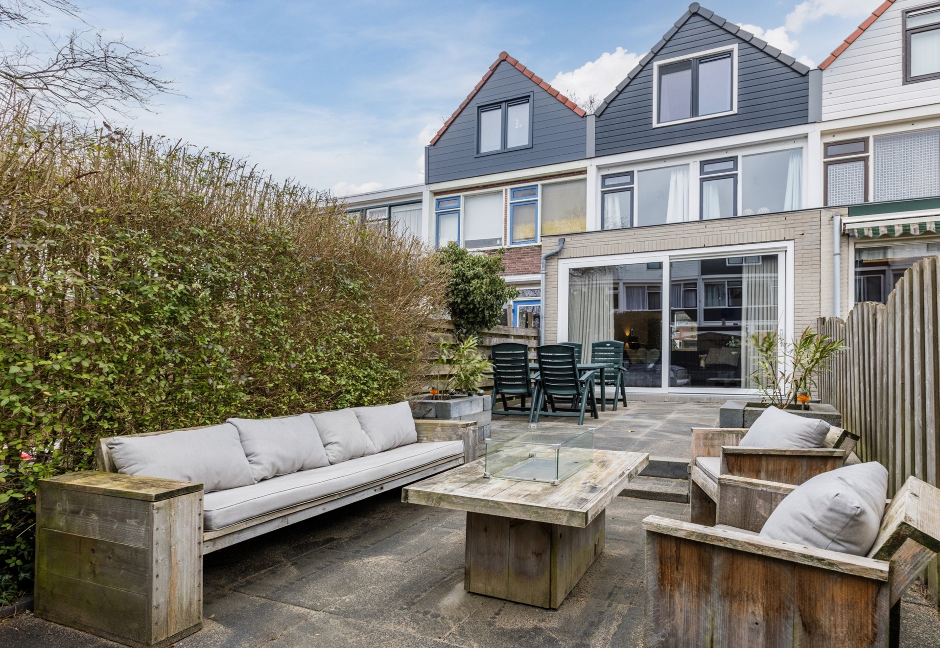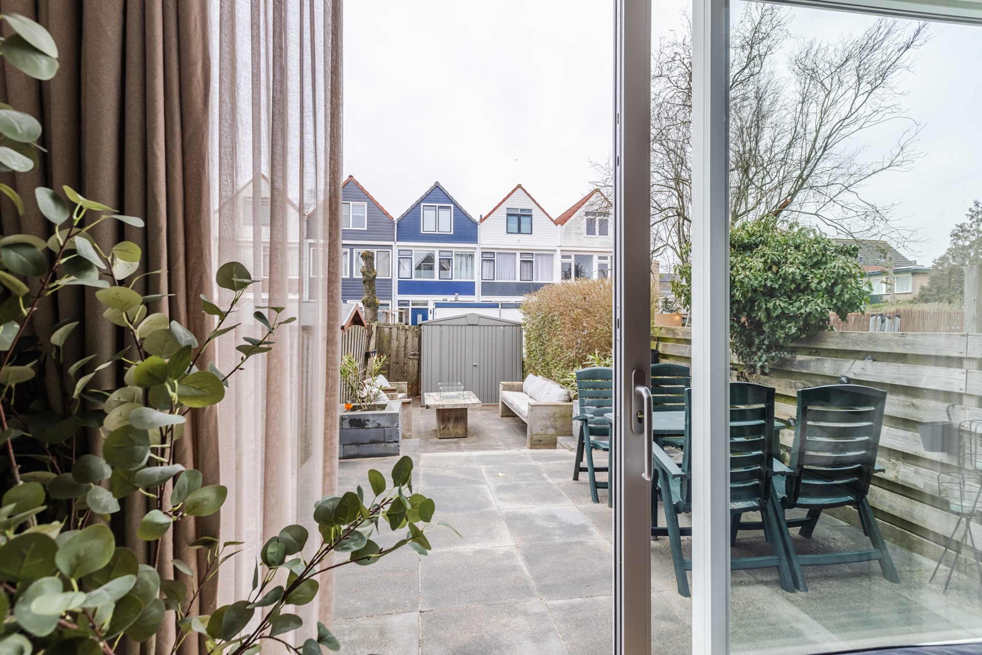 De voortuin is netjes bestraat en hier staat de berging. Riante zonnige achtertuin op het westen gelegen is recent aangelegd en onderhoudsvrij.