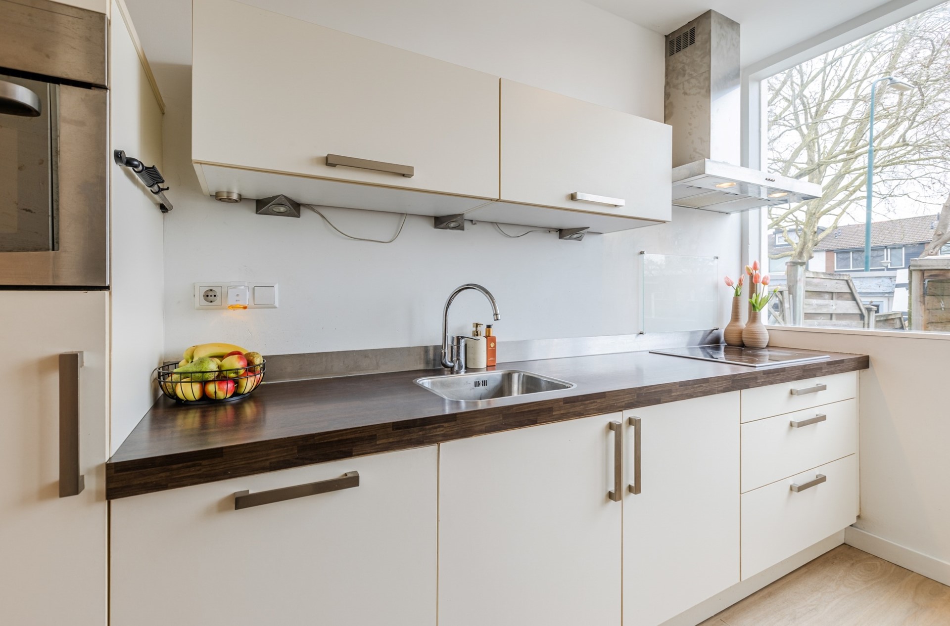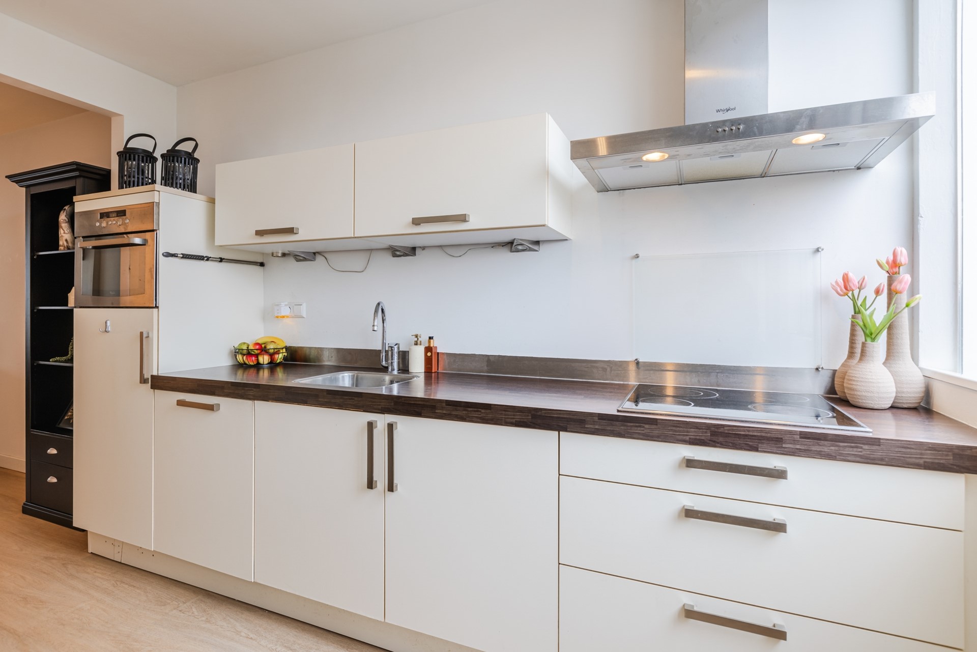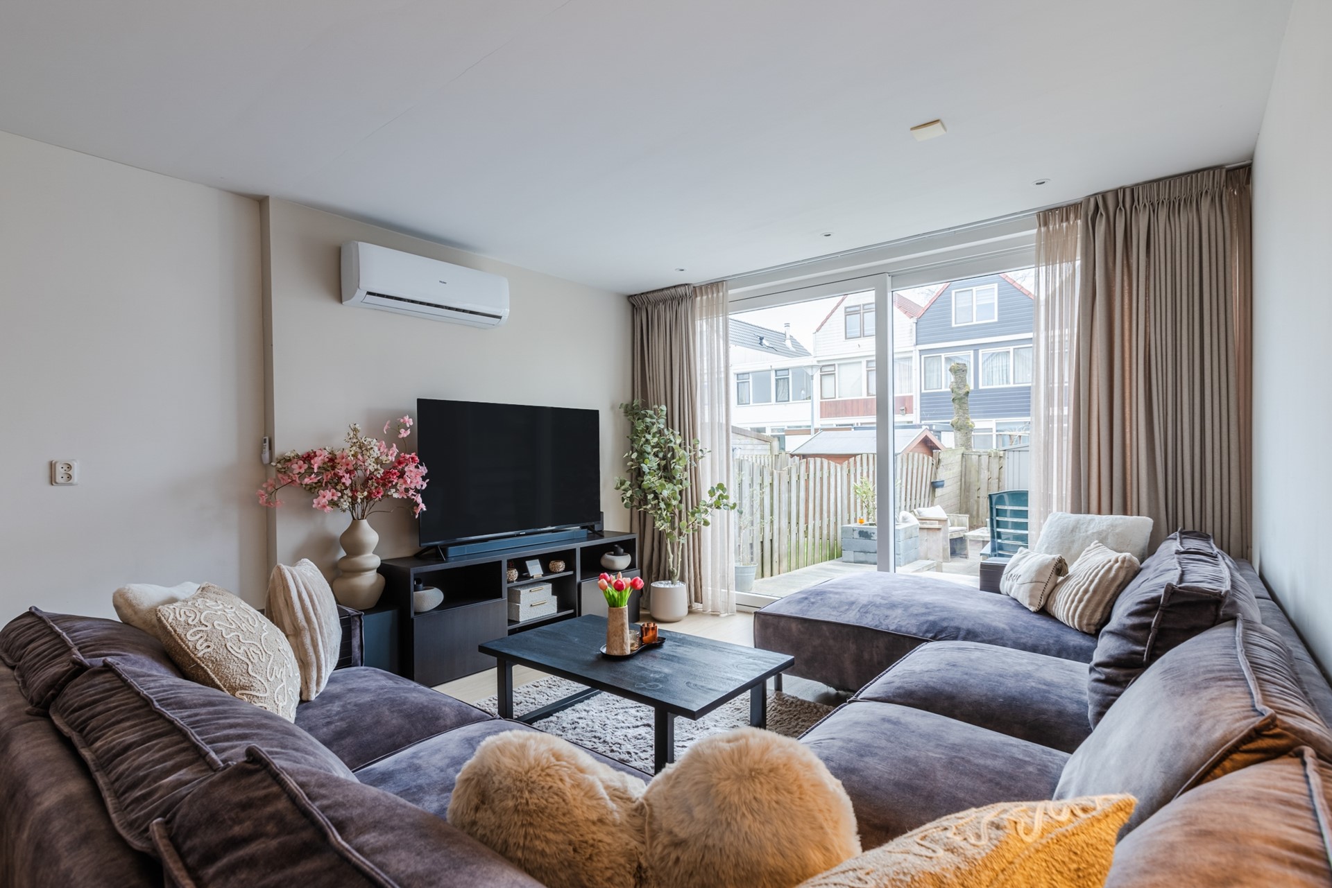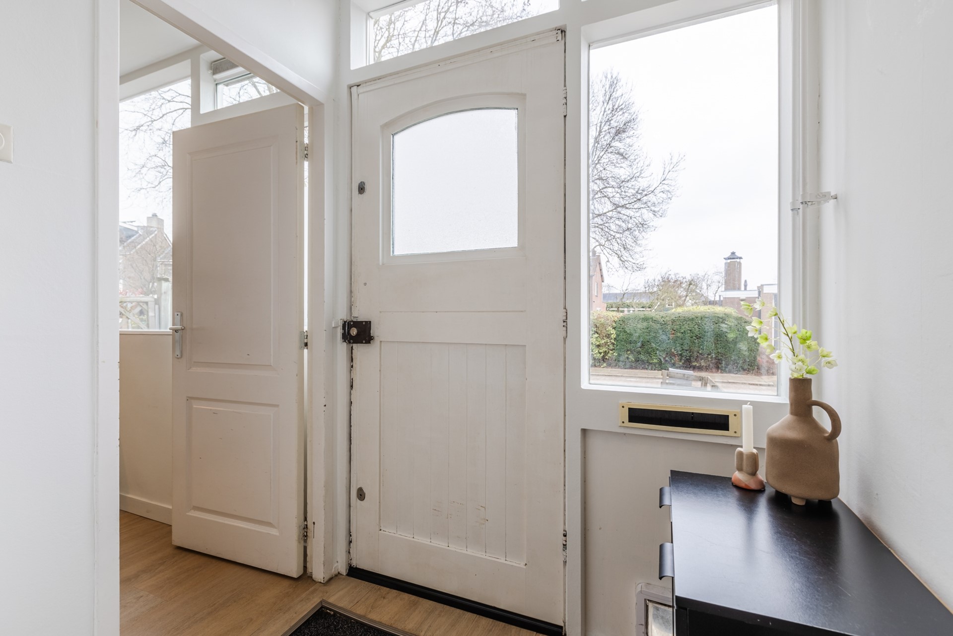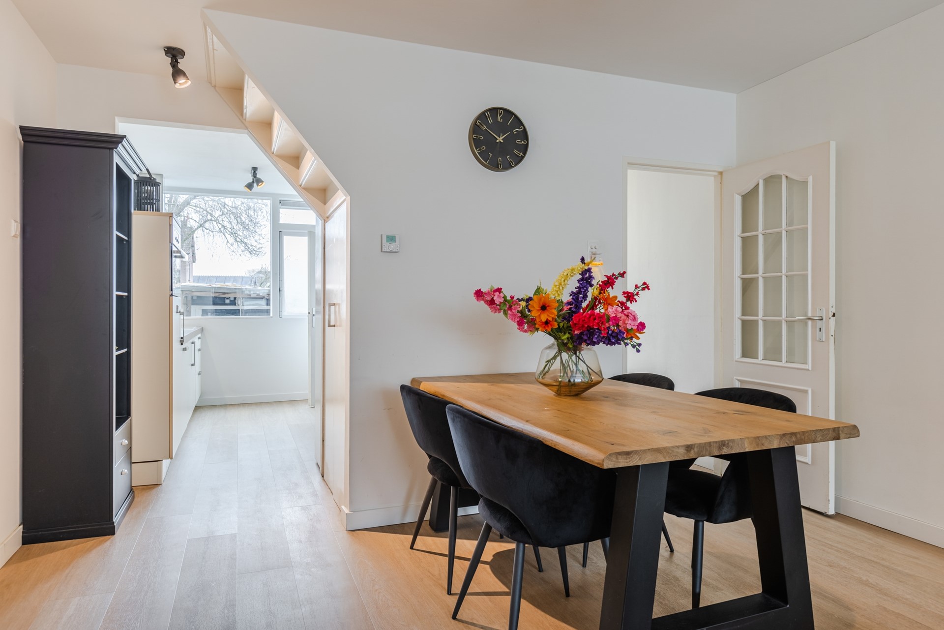Entree, hal, garderobe, meterkast en vaste trap naar de 1e verdieping Een modern toilet met vrijdragend toilet. Ruime en lichte uitgebouwde woonkamer met schuifpui naar de zonnige achtertuin. De woonkamer heeft vloerverwarming en airco. Half open keuken v.v. 4 pits elektrisch koken, afzuigkap, vaatwasser, koelkast met vriesvak en combimagnetron. Trapkast met wasmachineaansluiting. Kast met cv ketel Nefit 2017.