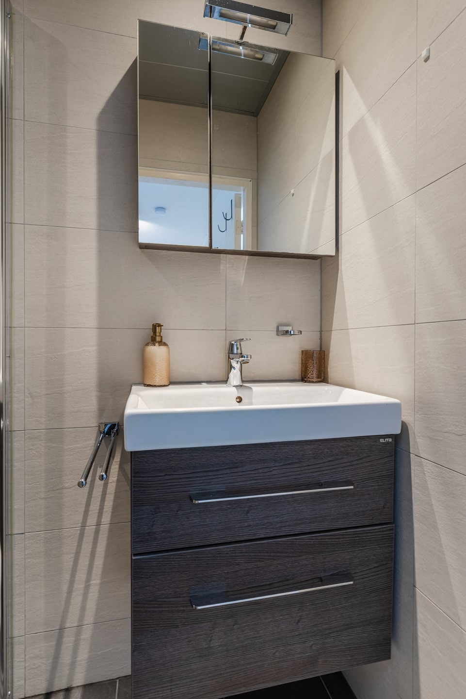 De overloop en 3 slaapkamers. Ruime slaapkamer met airco, wastafel en elektrisch zonnescherm aan de voorzijde. 2 soortgelijke slaapkamers aan de achterzijde. Badkamer met douche en wastafelmeubel. Vaste trap naar de 2e verdieping.
