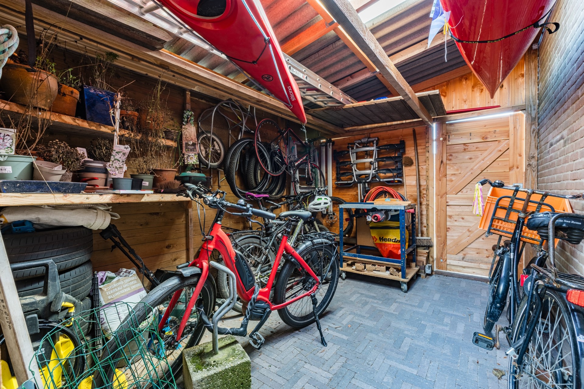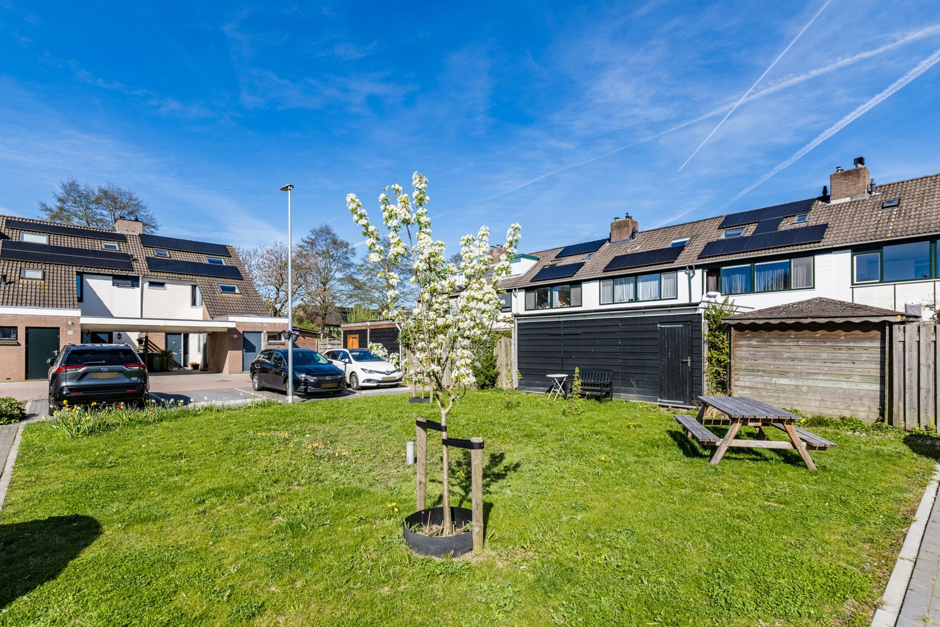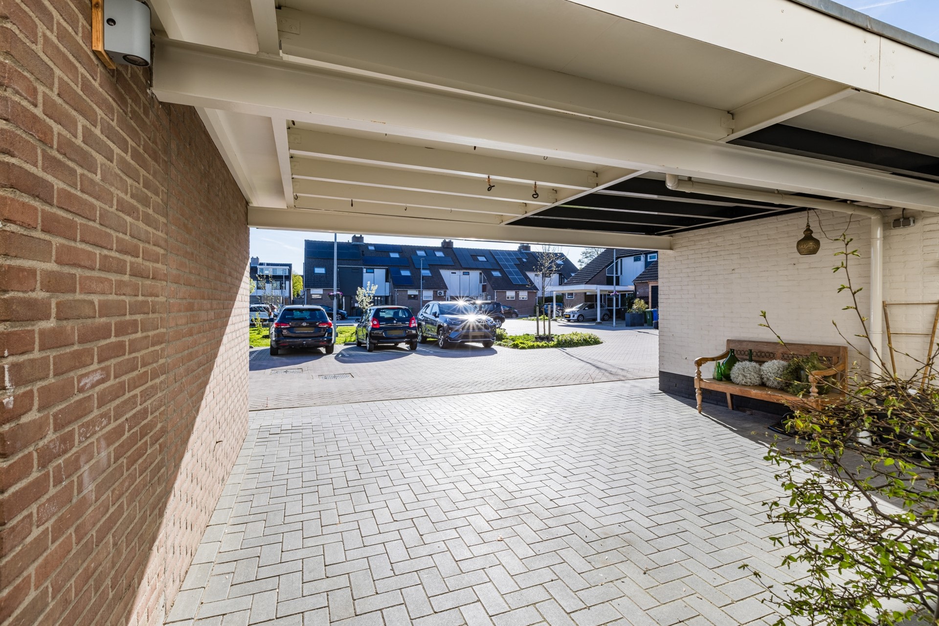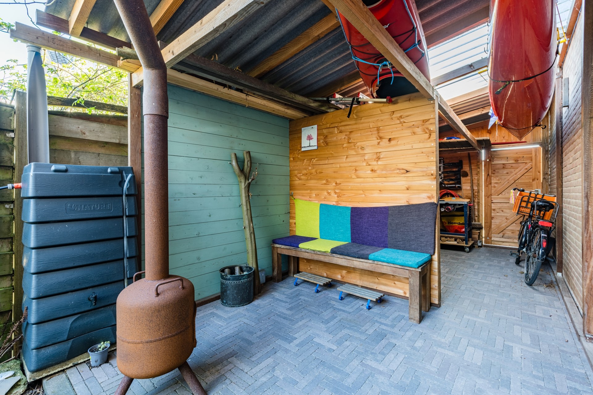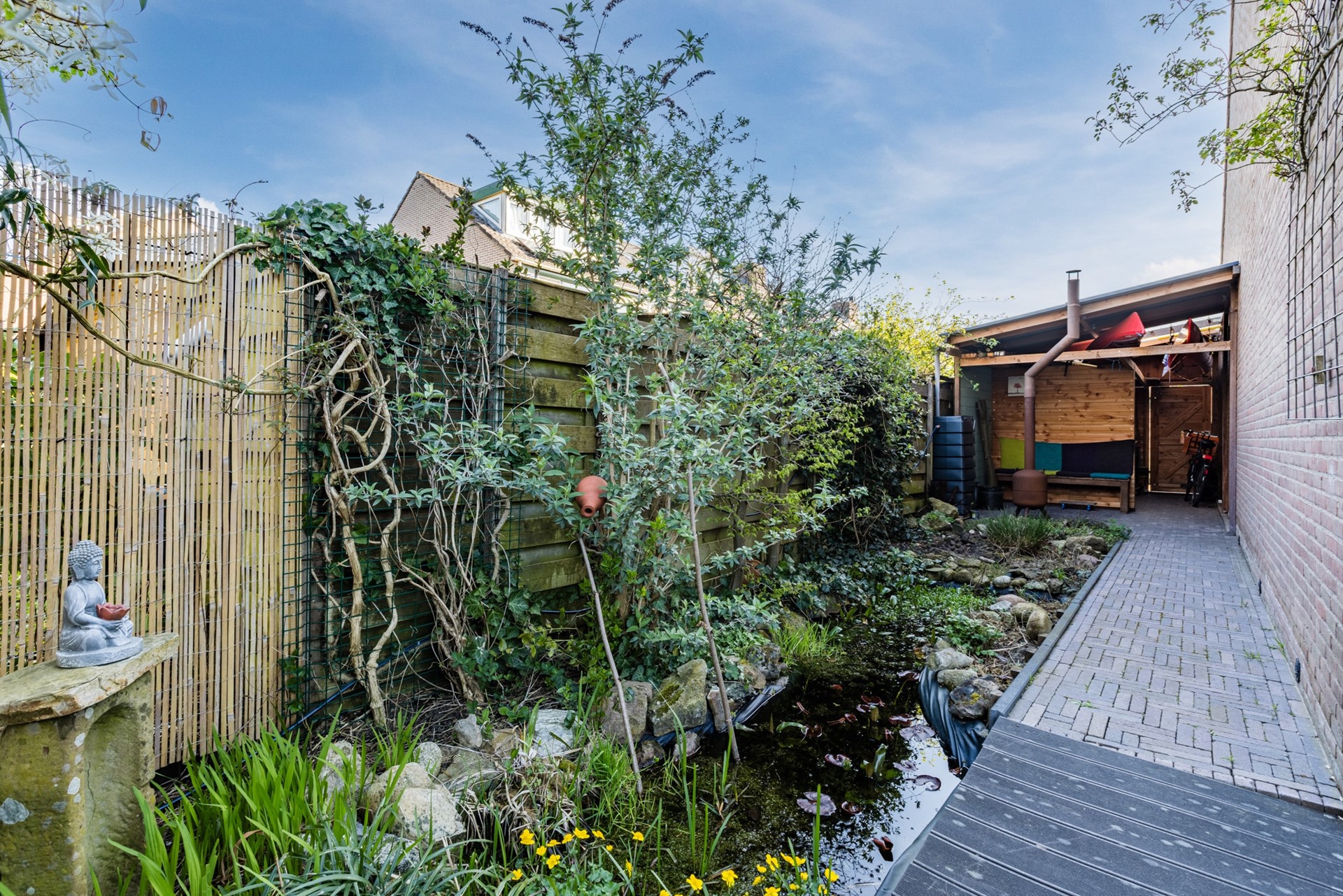 De voortuin is netjes bestraat. Je kunt hier gemakkelijk een auto parkeren op eigen terrein onder de carport. Via de zij-tuin kun je achterom en hier staat een handige berging met overkapping. De riante zonnige achtertuin ligt op het westen en heeft veel privacy, een vijver en een prachtig begroeide pergola.