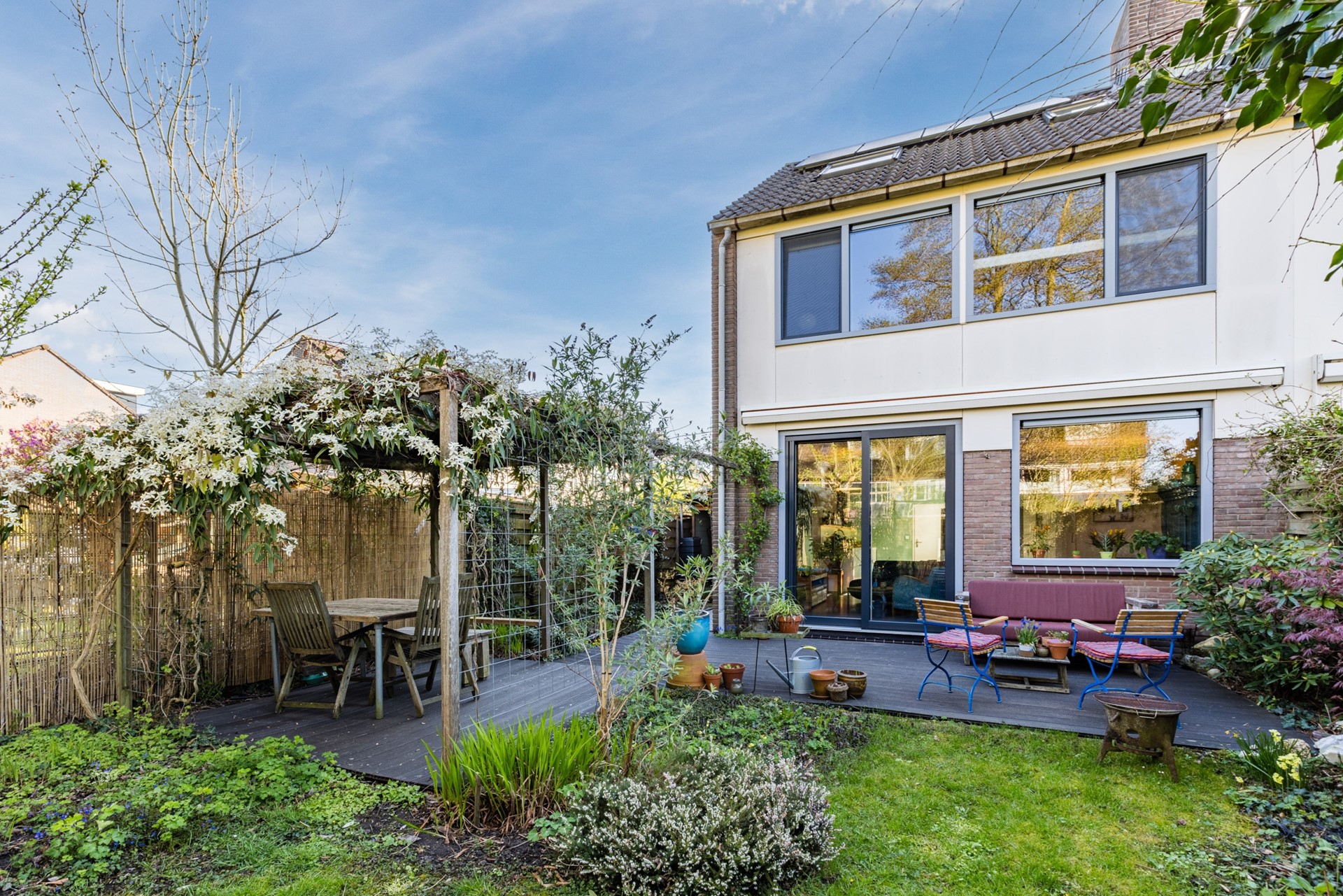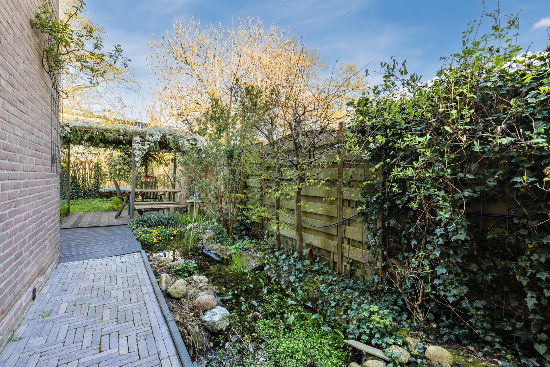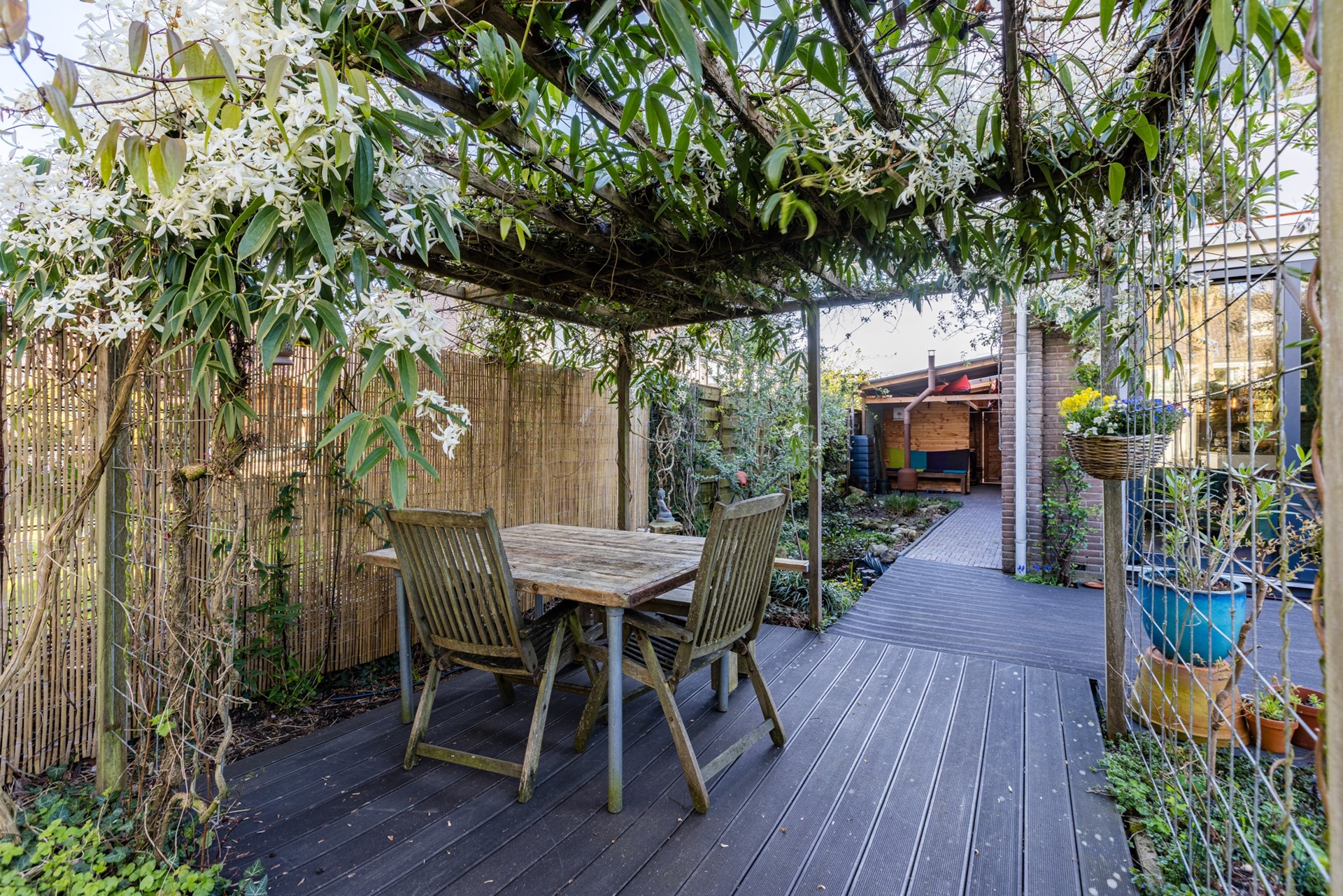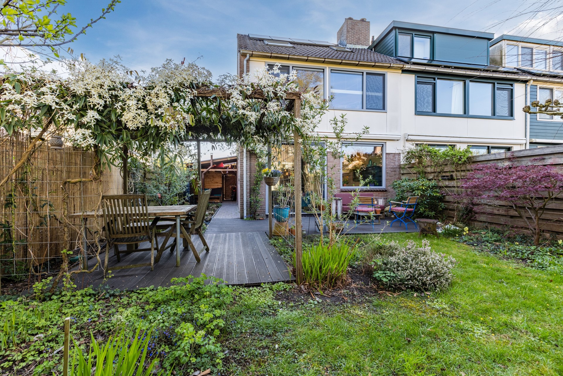 De voortuin is netjes bestraat. Je kunt hier gemakkelijk een auto parkeren op eigen terrein onder de carport. Via de zij-tuin kun je achterom en hier staat een handige berging met overkapping. De riante zonnige achtertuin ligt op het westen en heeft veel privacy, een vijver en een prachtig begroeide pergola.