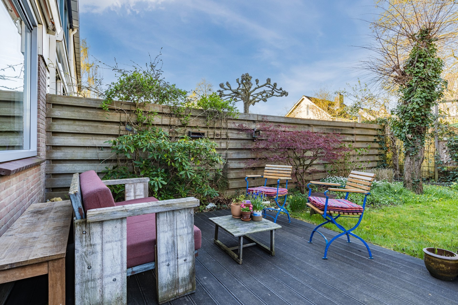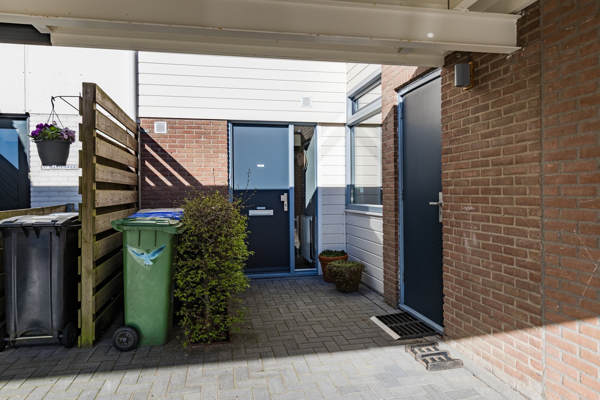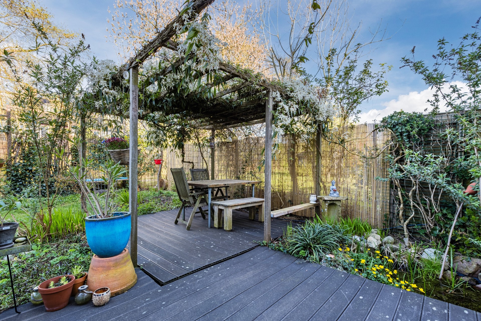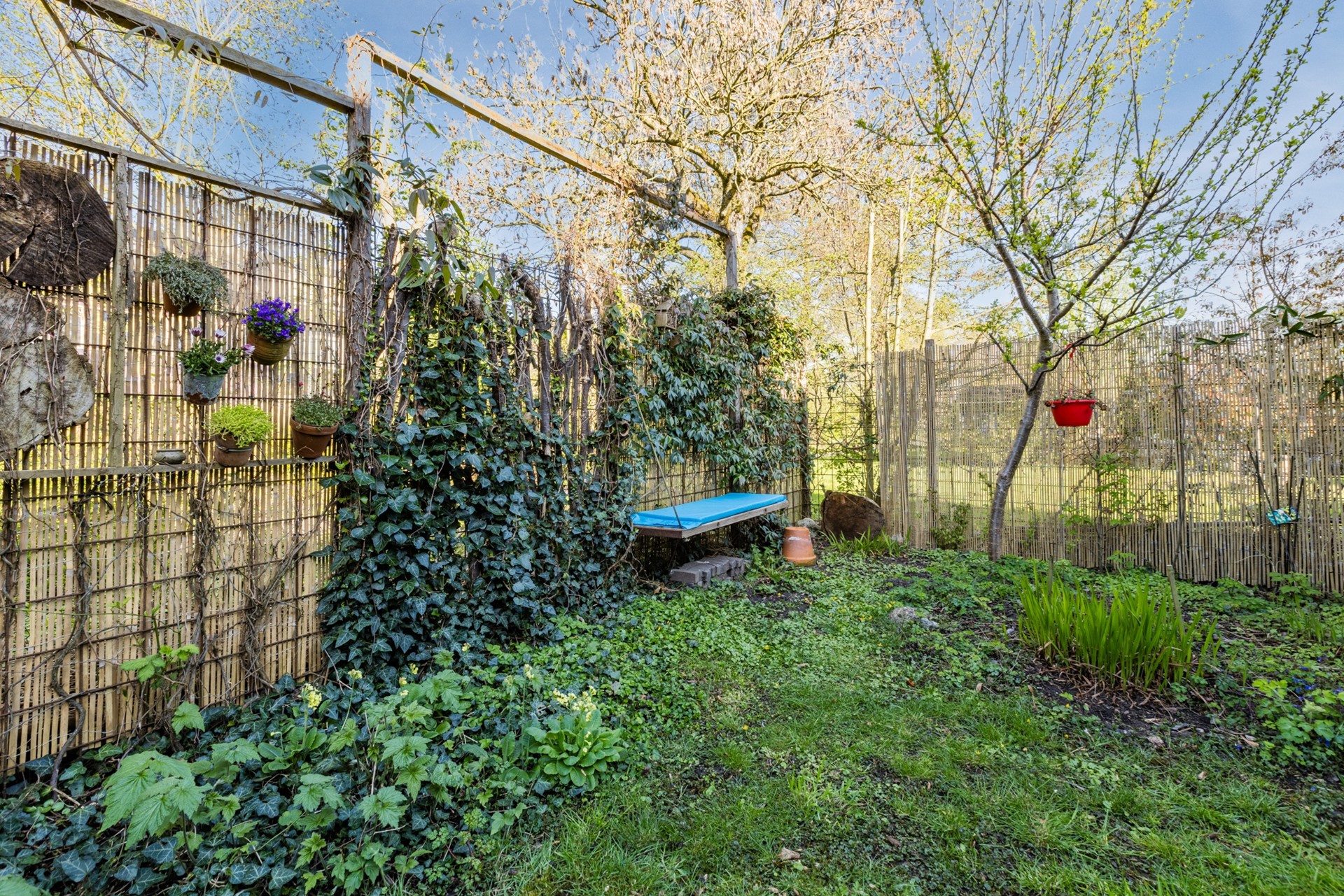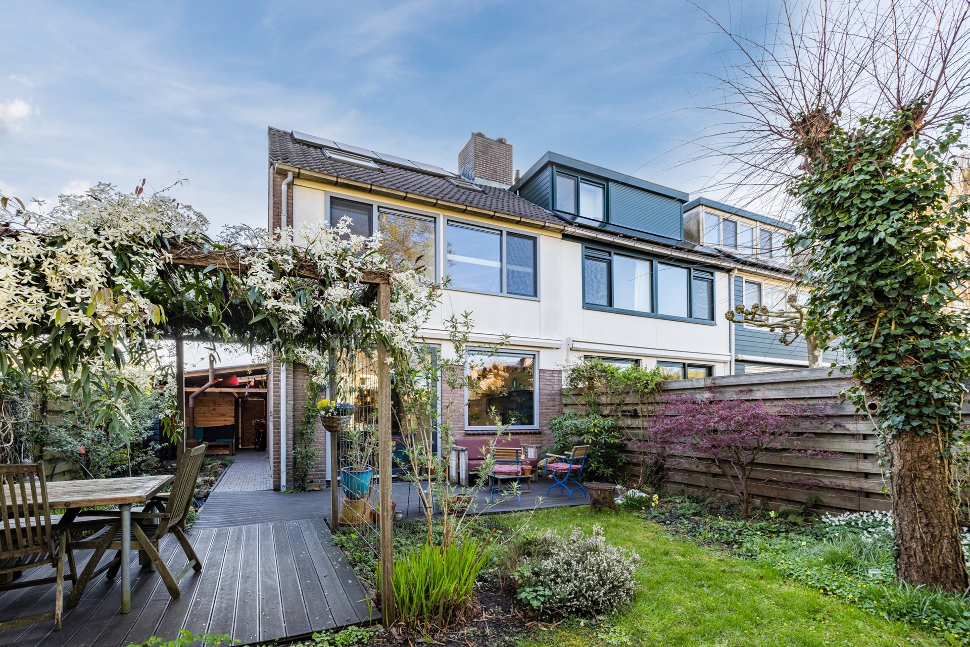 De voortuin is netjes bestraat. Je kunt hier gemakkelijk een auto parkeren op eigen terrein onder de carport. Via de zij-tuin kun je achterom en hier staat een handige berging met overkapping. De riante zonnige achtertuin ligt op het westen en heeft veel privacy, een vijver en een prachtig begroeide pergola.