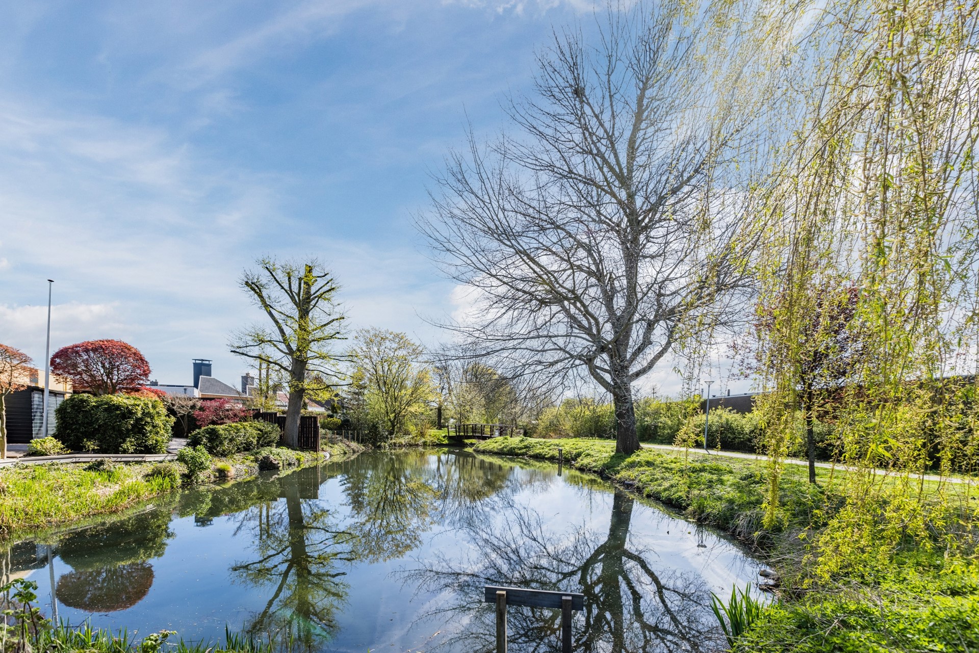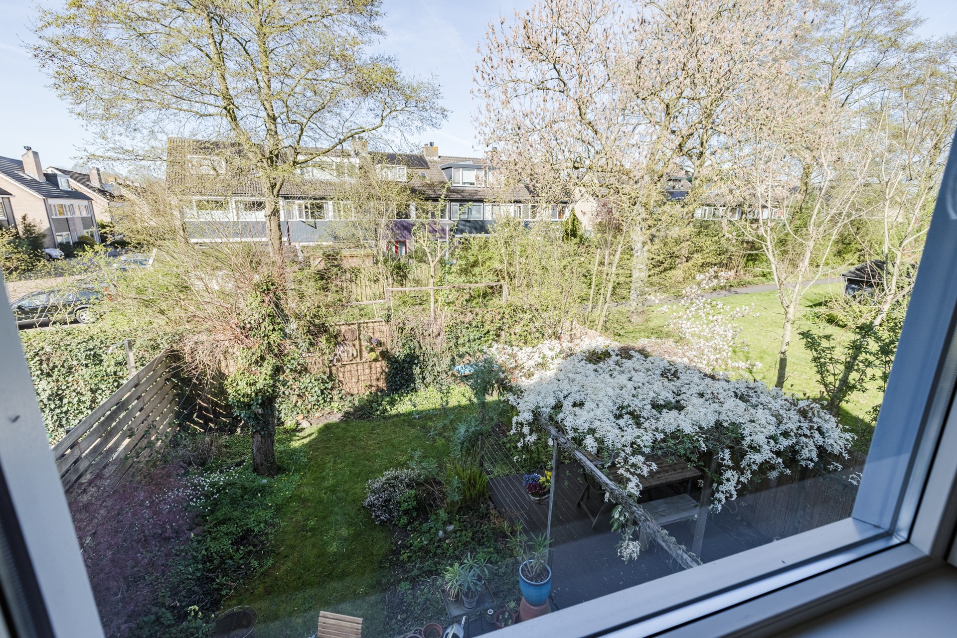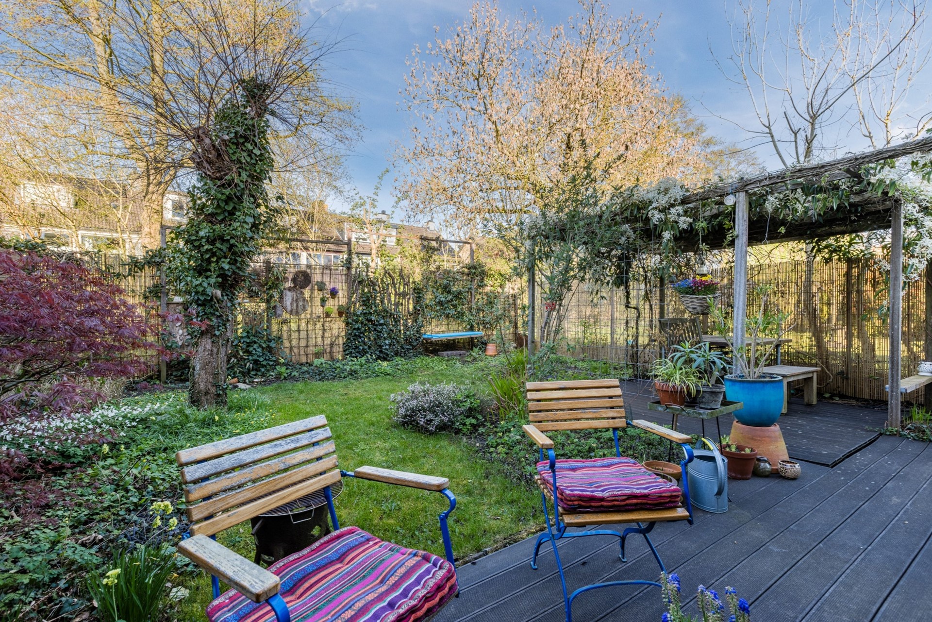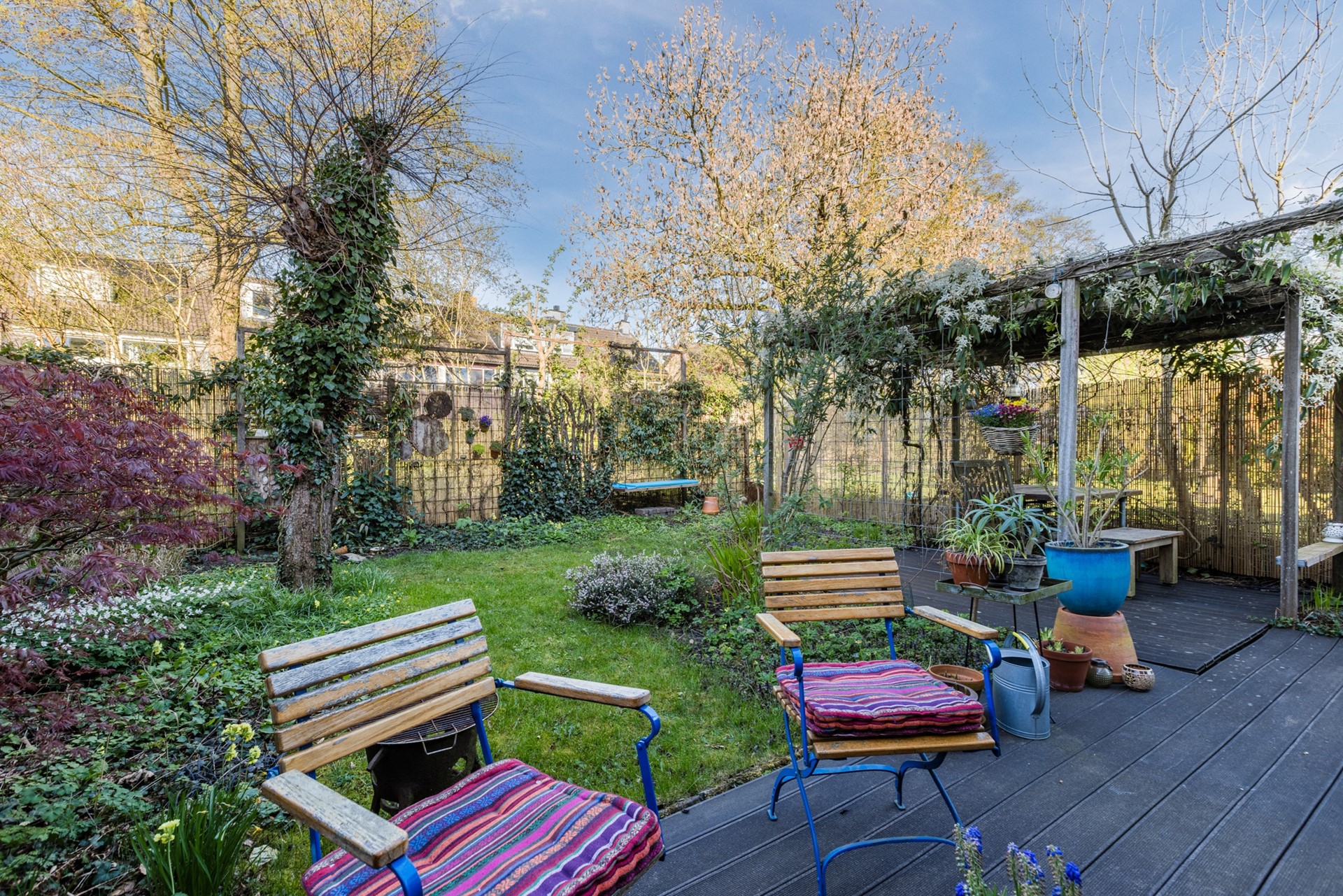 De voortuin is netjes bestraat. Je kunt hier gemakkelijk een auto parkeren op eigen terrein onder de carport. Via de zij-tuin kun je achterom en hier staat een handige berging met overkapping. De riante zonnige achtertuin ligt op het westen en heeft veel privacy, een vijver en een prachtig begroeide pergola.
