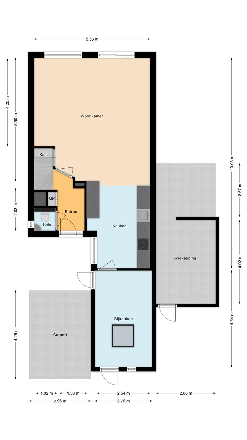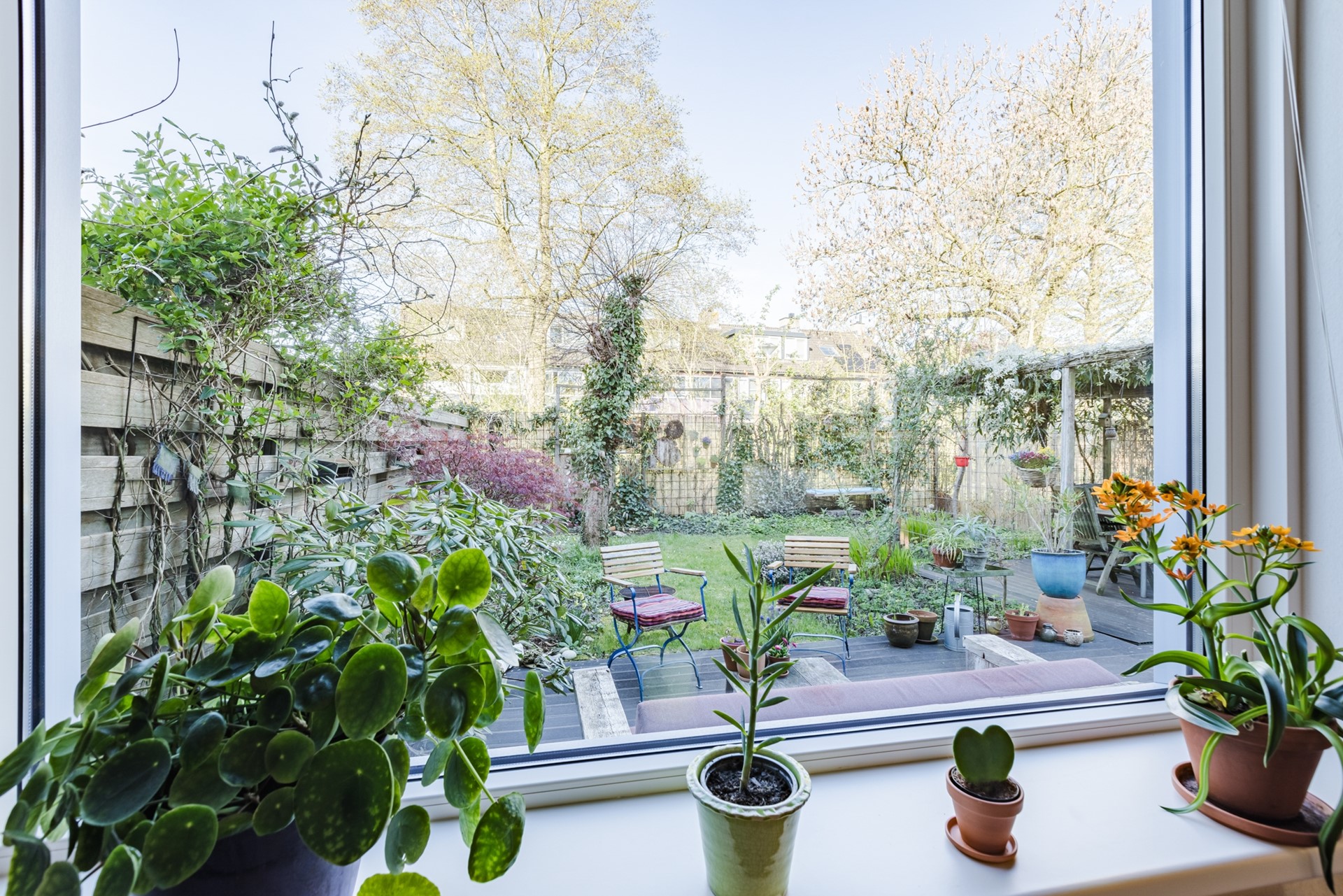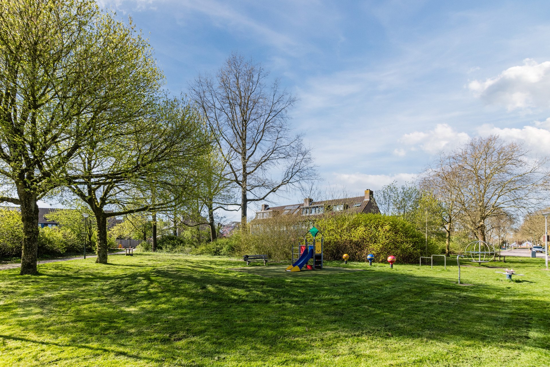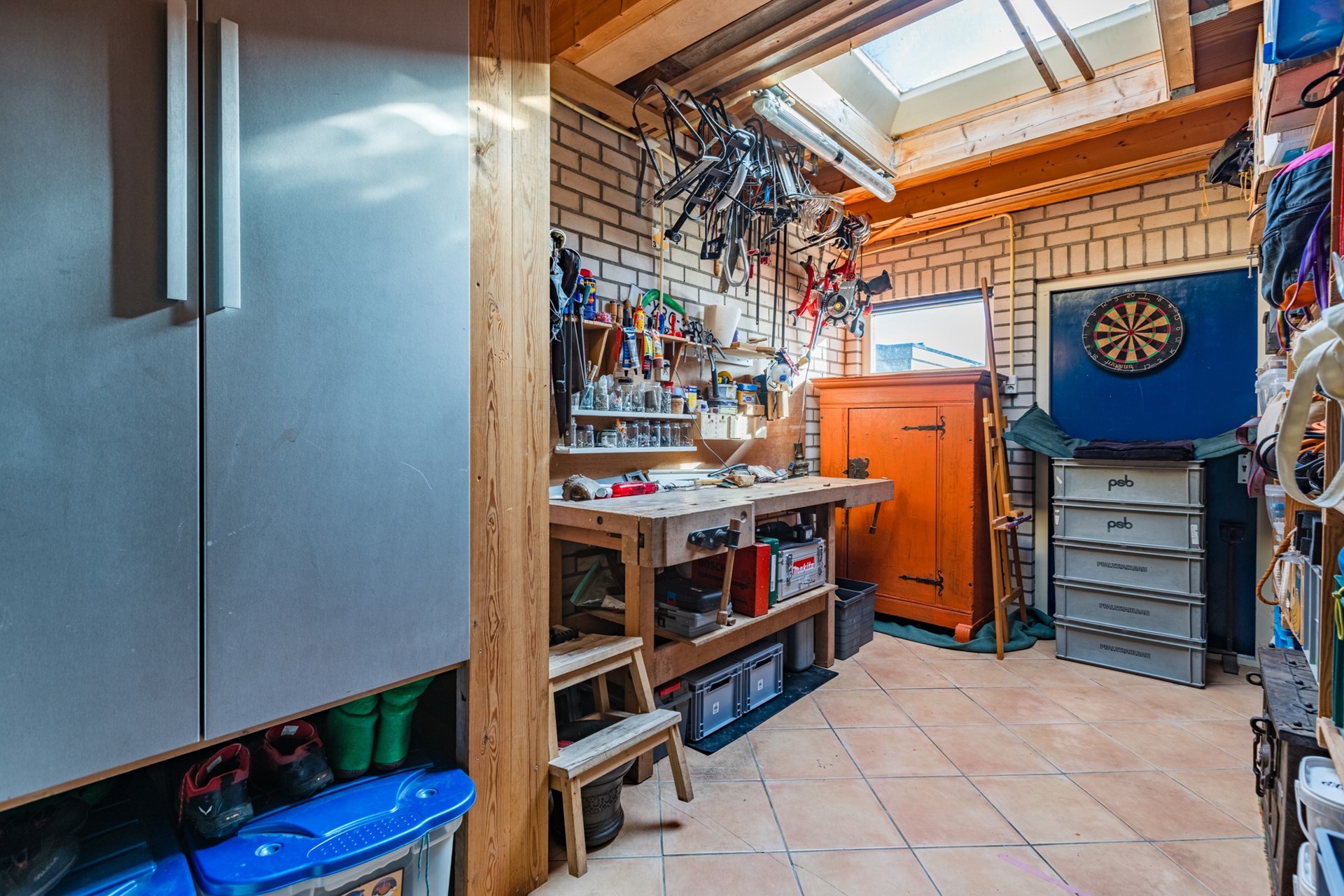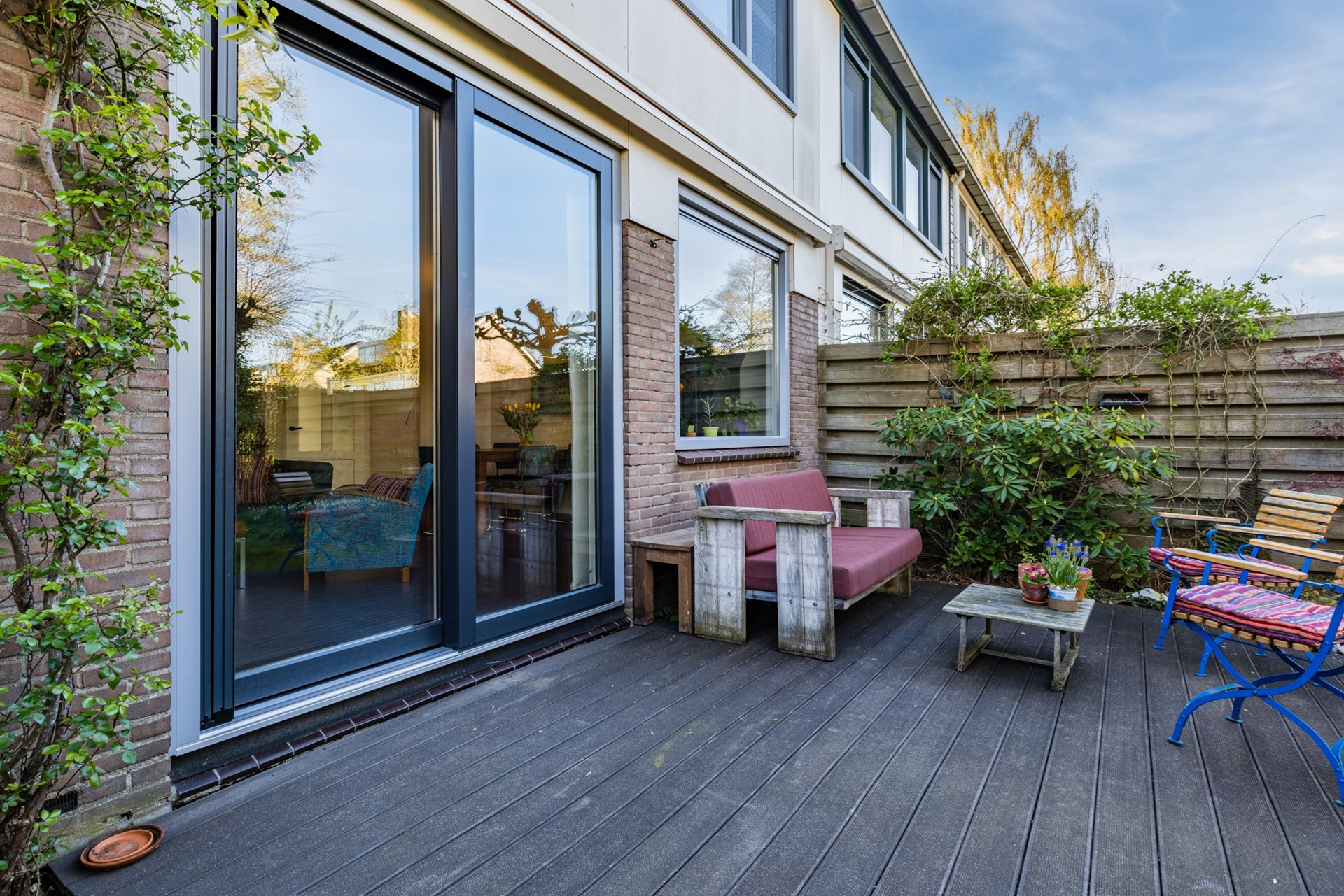 De voortuin is netjes bestraat. Je kunt hier gemakkelijk een auto parkeren op eigen terrein onder de carport. Via de zij-tuin kun je achterom en hier staat een handige berging met overkapping. De riante zonnige achtertuin ligt op het westen en heeft veel privacy, een vijver en een prachtig begroeide pergola.