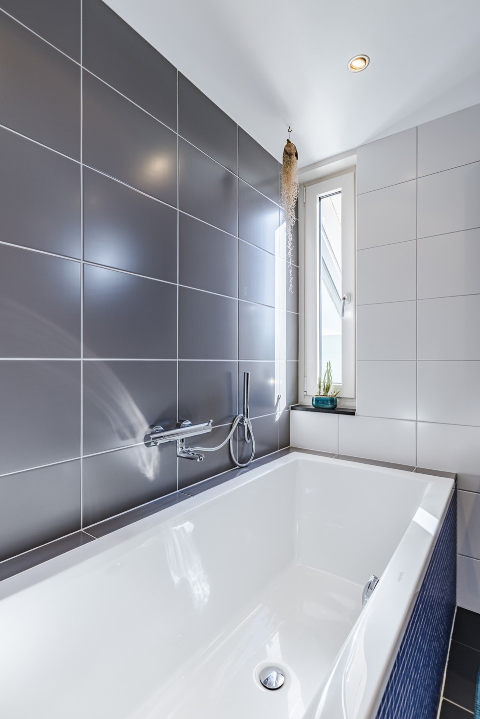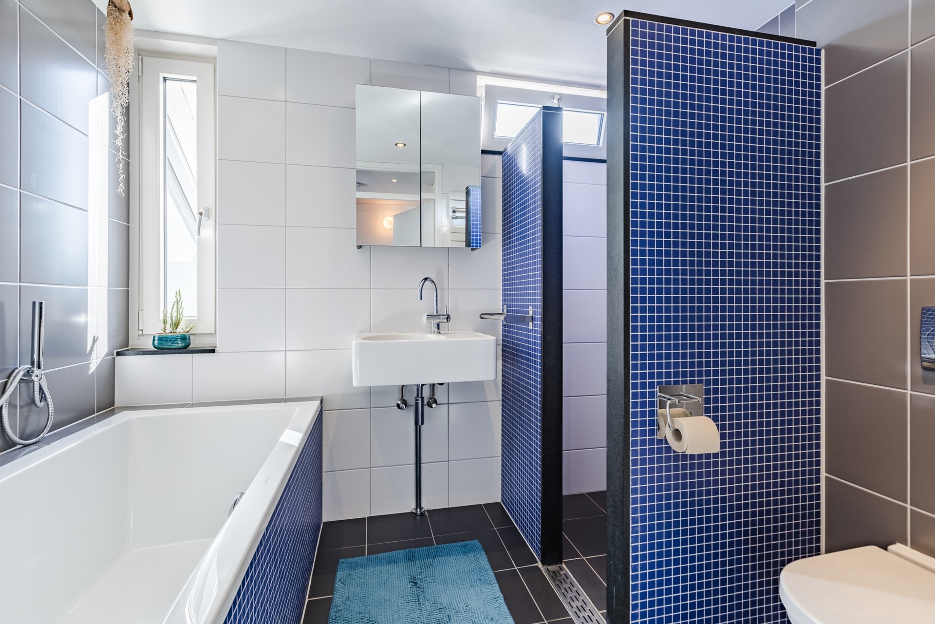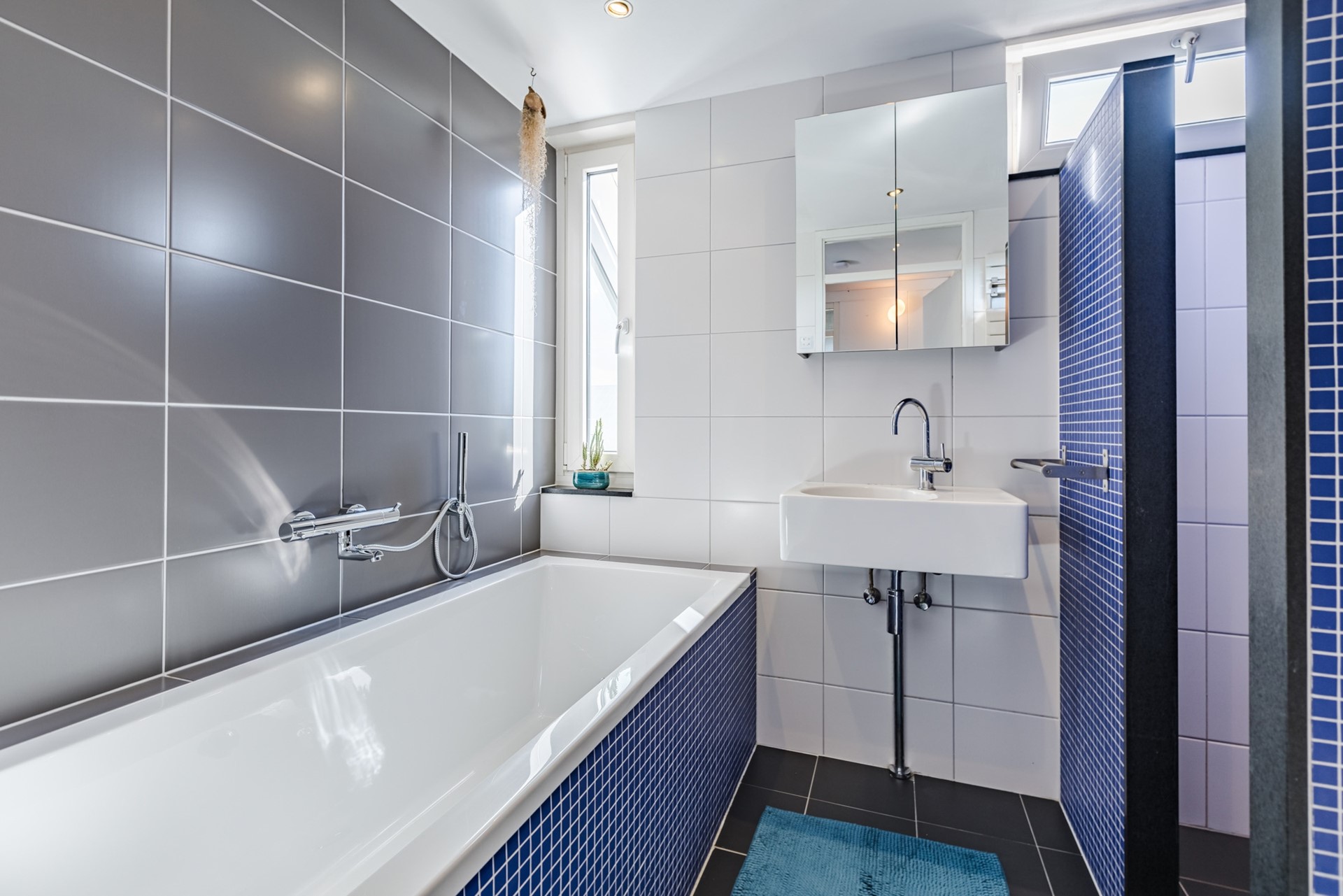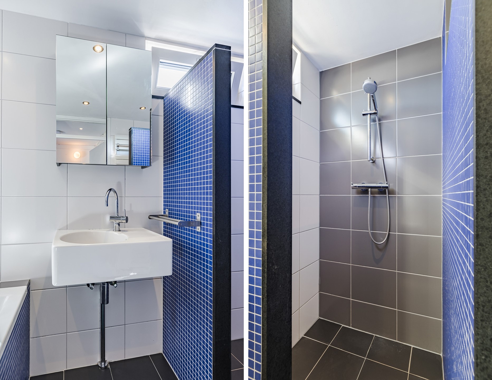 De overloop en 3 slaapkamers. 2 ruime slaapkamers liggen aan de achterzijde en 1 daarvan heeft een vaste kast. De andere ruime slaapkamer ligt aan de voorzijde. Een moderne badkamer met bad, inloopdouche, een vaste wastafel en vrijdragend (2e) toilet. Vaste trap naar de 2e verdieping.
