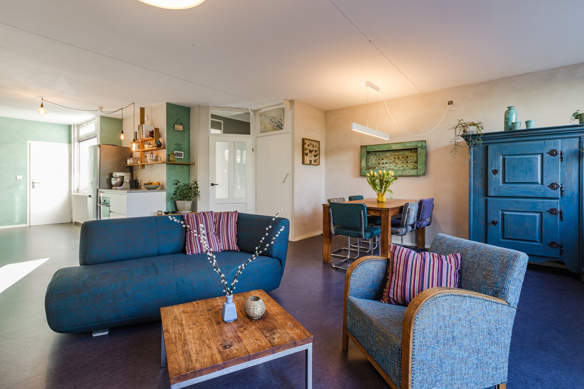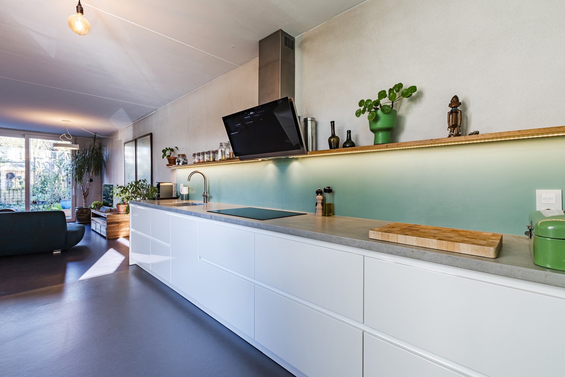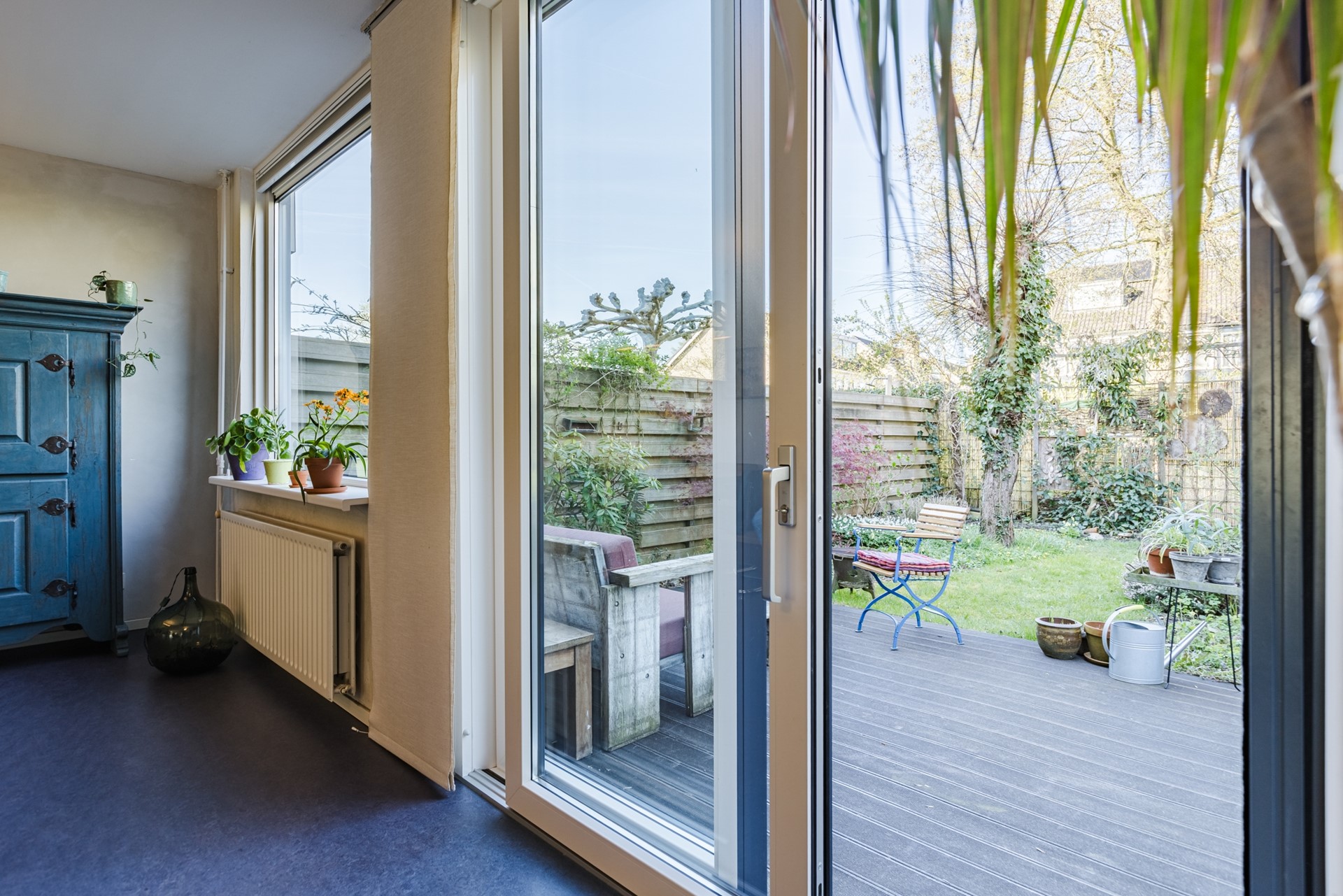 Entree, hal, garderobe, meterkast en vaste trap naar de 1e verdieping. Toiletruimte met vrijdragend toilet en fonteintje. Ruime lichte woonkamer met vloerverwarming, trapkast en schuifpui naar de zonnige tuin. Moderne open keuken 2020 met inductie kookplaat, afzuigkap, vaatwasser, kokend water kraan, stoomoven en een losse koel-vriescombinatie. Lichte bijkeuken/berging met lichtkoepel en opbergzolder.