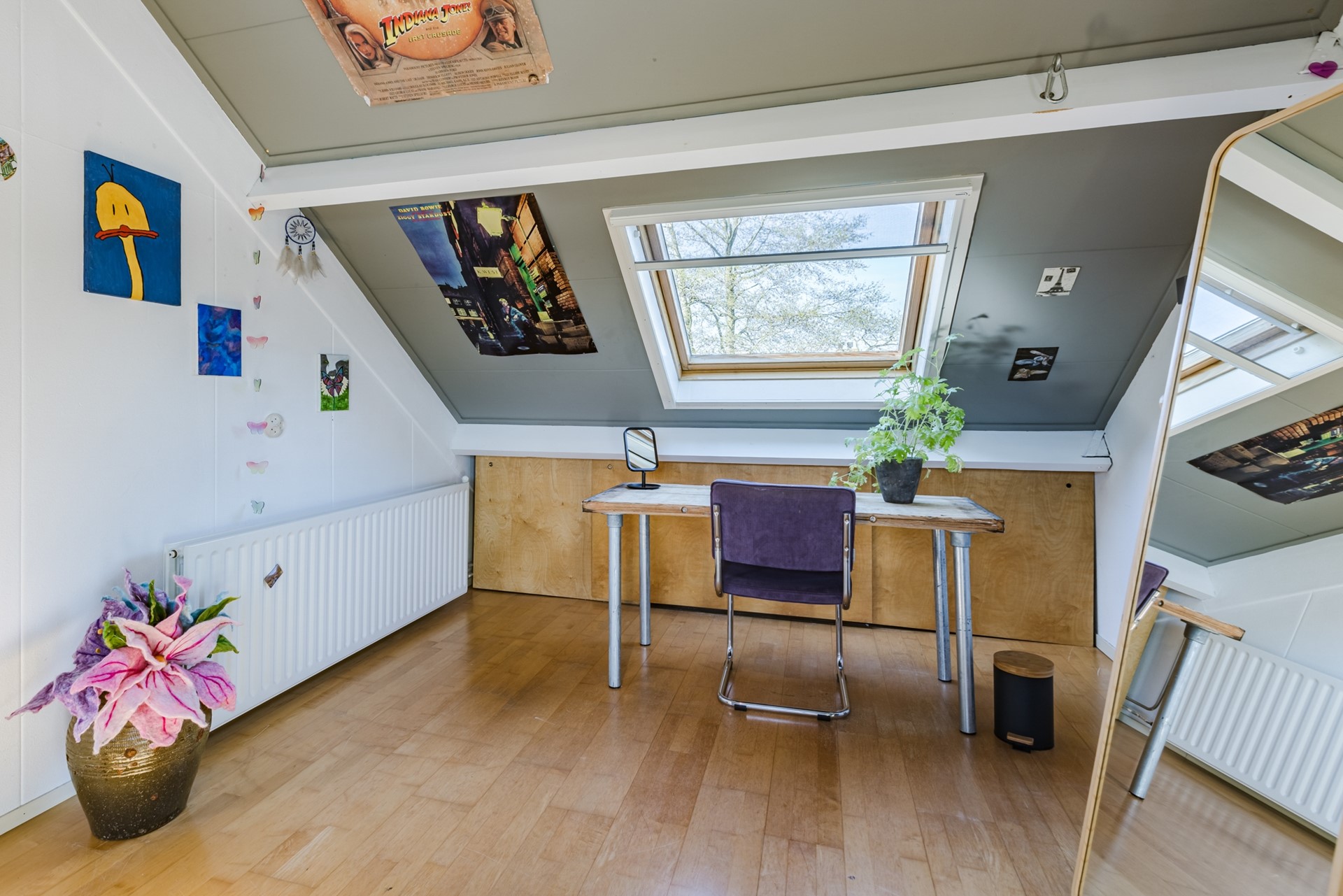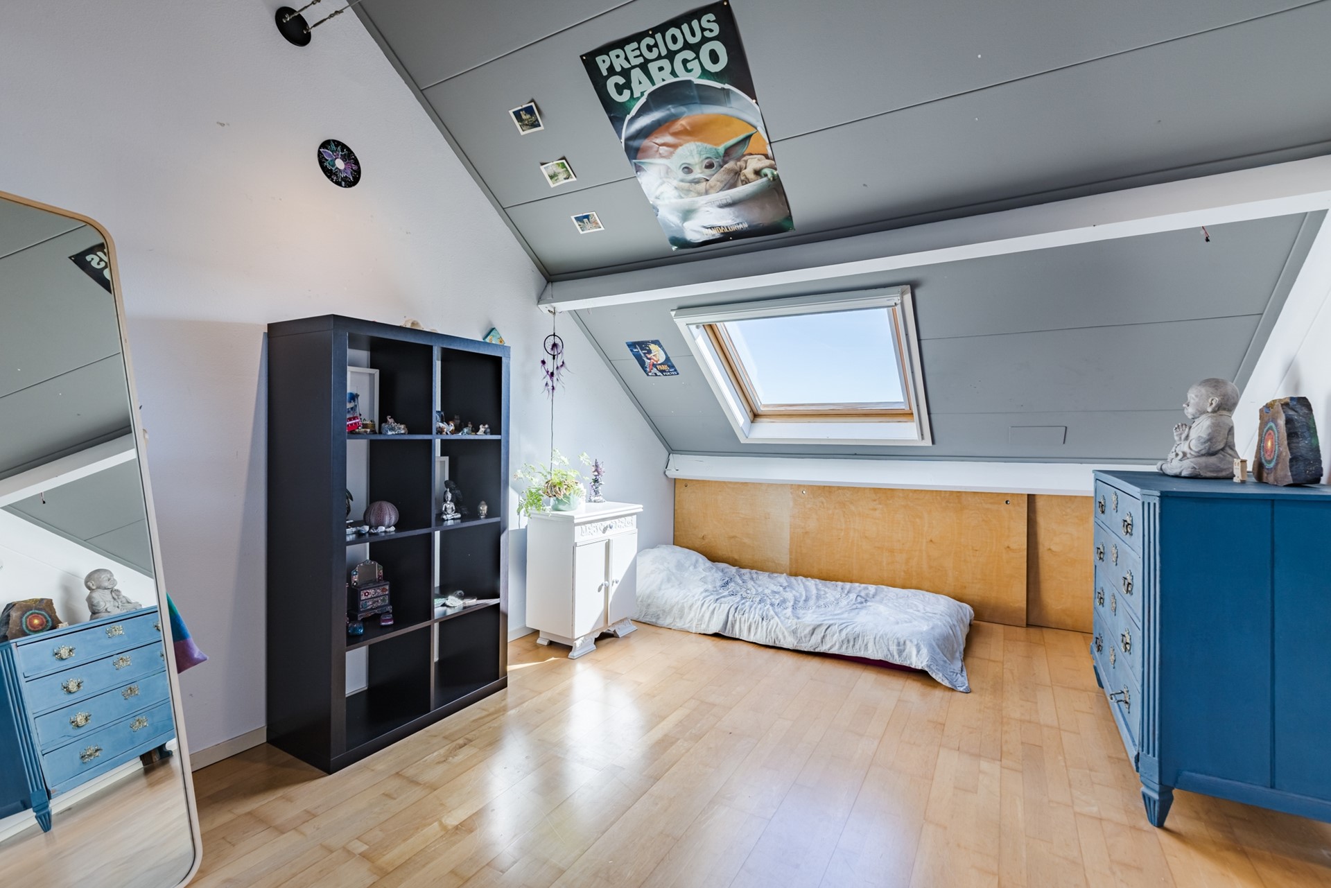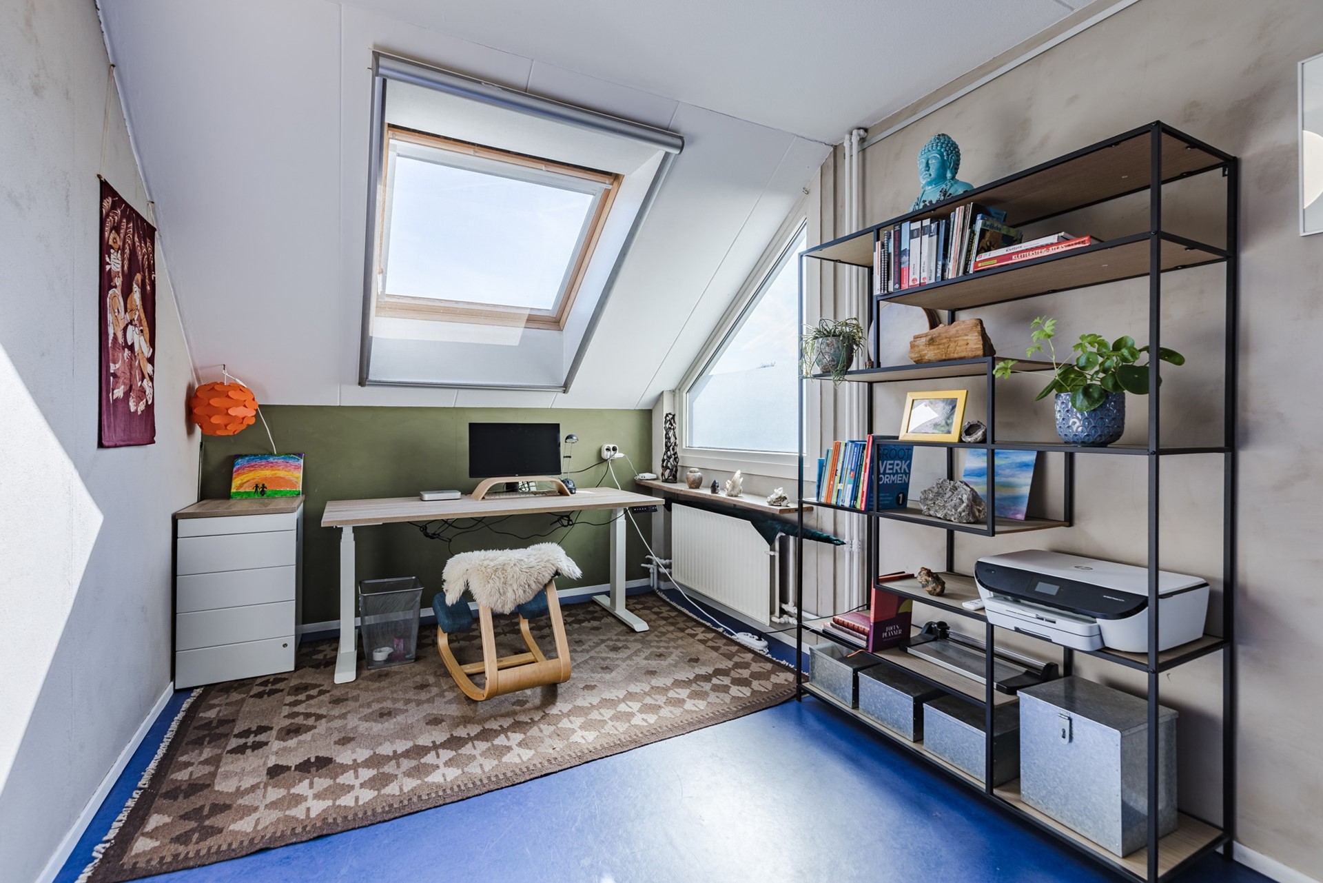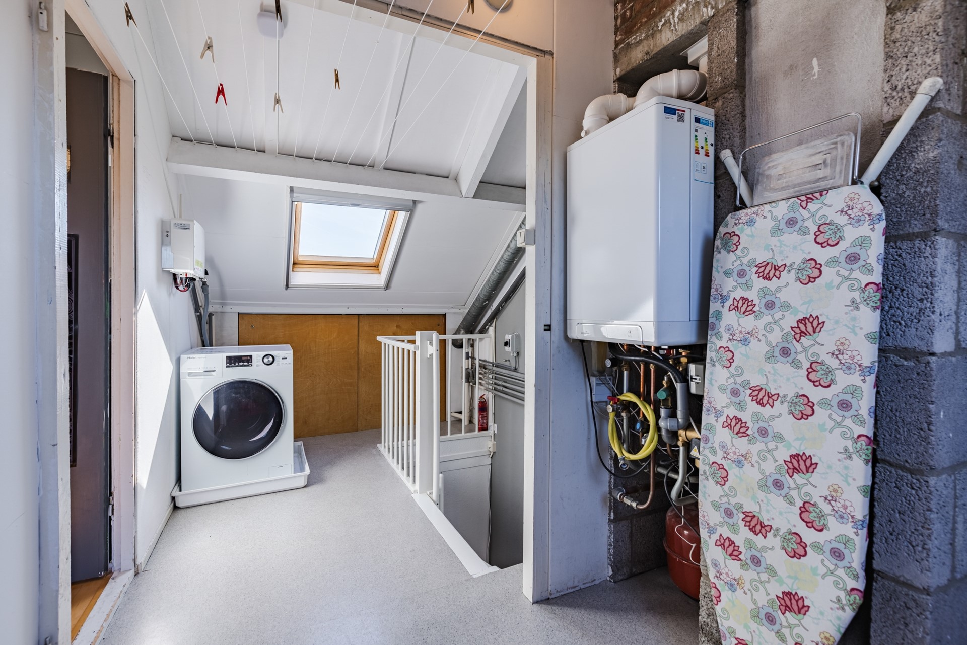 Overloop met opstelplaats voor de cv combiketel Intergas 2022, elektrische boiler op zonnestroom, wasmachine- en drogeraansluiting, m.v. box en omvormer zonnepanelen. Ruime en lichte slaapkamer met 2 Velux dakramen.