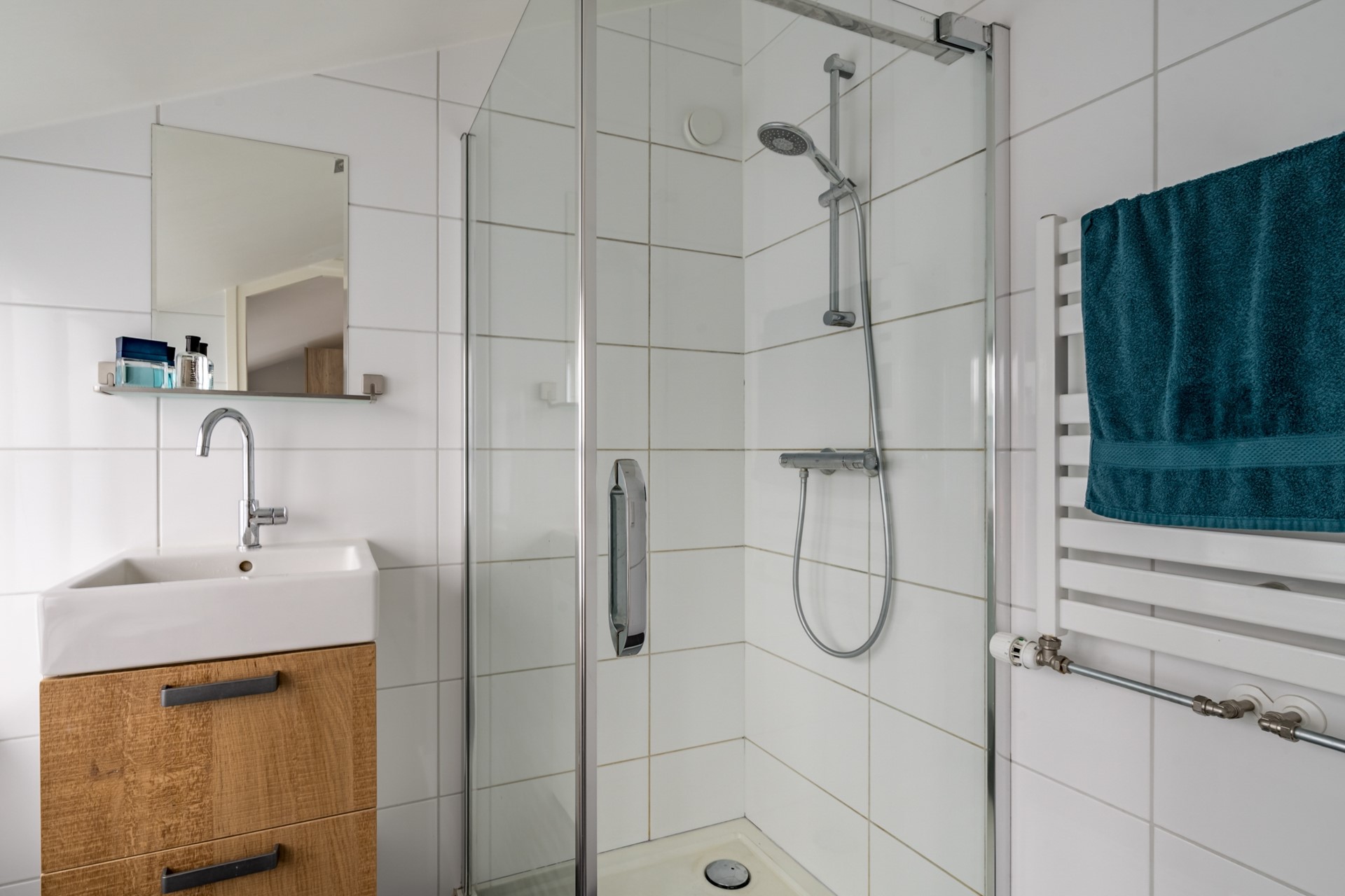 De overloop met c.v. ketel Remeha (2010). Ruime slaapkamer met veel licht door de dakkapellen. Een moderne badkamer met douchecabine en wastafel(2015).